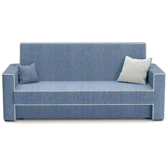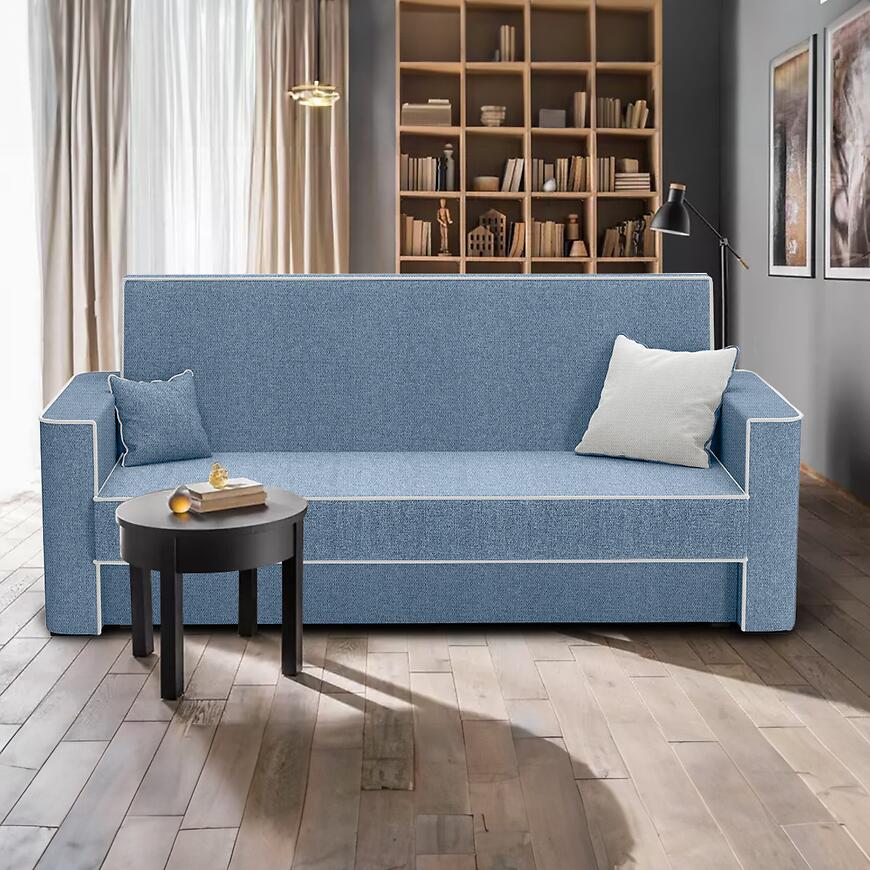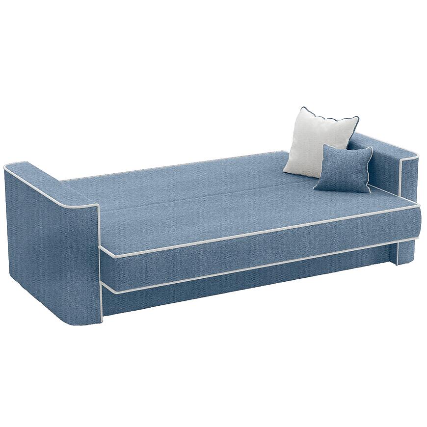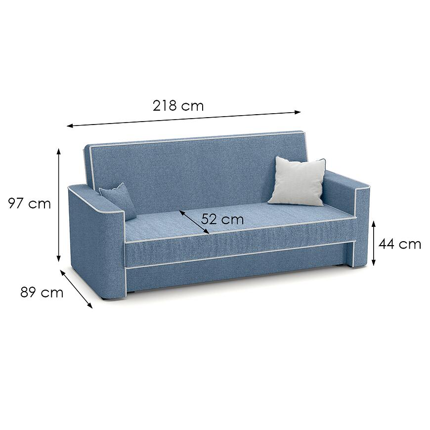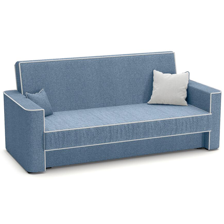 Kanapa Lumia Aragon 74+80 to klasyczna sofa o wymiarach 218×89×97 cm, wyposażona w funkcję spania o powierzchni 116×190 cm z mechanizmem wersalkowym (automat wersalkowy). Siedzisko ma wysokość 44 cm i głębokość 52 cm, wypełnione jest sprężyną bonell, co zapewnia komfort codziennego użytkowania. Tapicerka wykonana jest z tkaniny w kolorze niebieskim, z ozdobną kontrastową lamówką. Sofa posiada jeden pojemnik na pościel, w komplecie są poduszki, nie jest modułowa, posiada nóżki i wymaga samodzielnego montażu. Idealna do klasycznych wnętrz o średniej powierzchni.