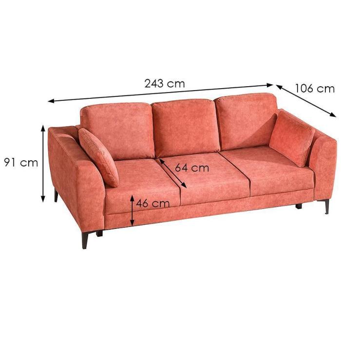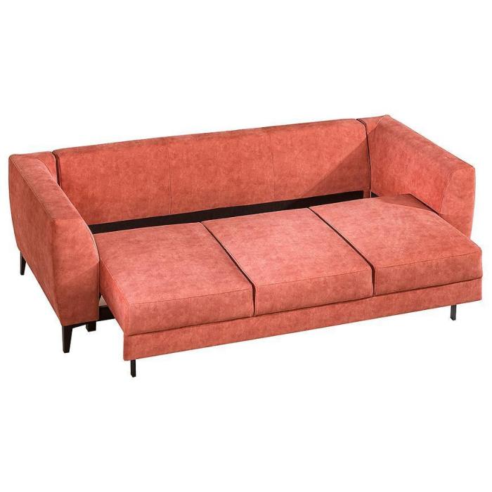 Kanapa Marino w kolorze pomarańczowym to praktyczna i funkcjonalna kanapa zaprojektowana w nowoczesnym stylu. Mebel ten posiada funkcję spania oraz praktyczny pojemnik na pościel. Po rozłożeniu to okazjonalne miejsce do spania o wymiarach 136x200cm. System rozkładnia jest bardzo prosty- DL. Wypełnienie mebla stanowi sprężyna falista i pianka, które zwiększają komfort podczas codziennego użytkowania. Świetnie sprawdzi się zarówno w salonie jak i pokoju dziennym, pełniąc funkcję miejsca spotkań.