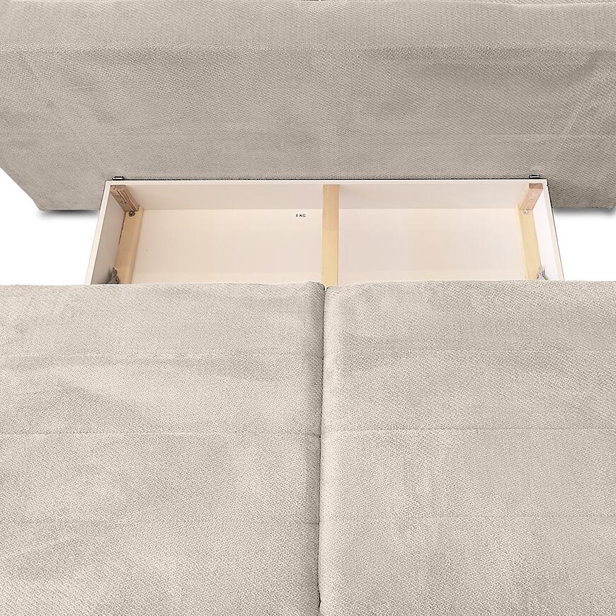 Pod siedziskiem znajduje się jeden pojemny schowek na pościel, który ułatwia utrzymanie porządku. To praktyczny dodatek szczególnie doceniany w mieszkaniach, gdzie liczy się efektywne wykorzystanie przestrzeni.