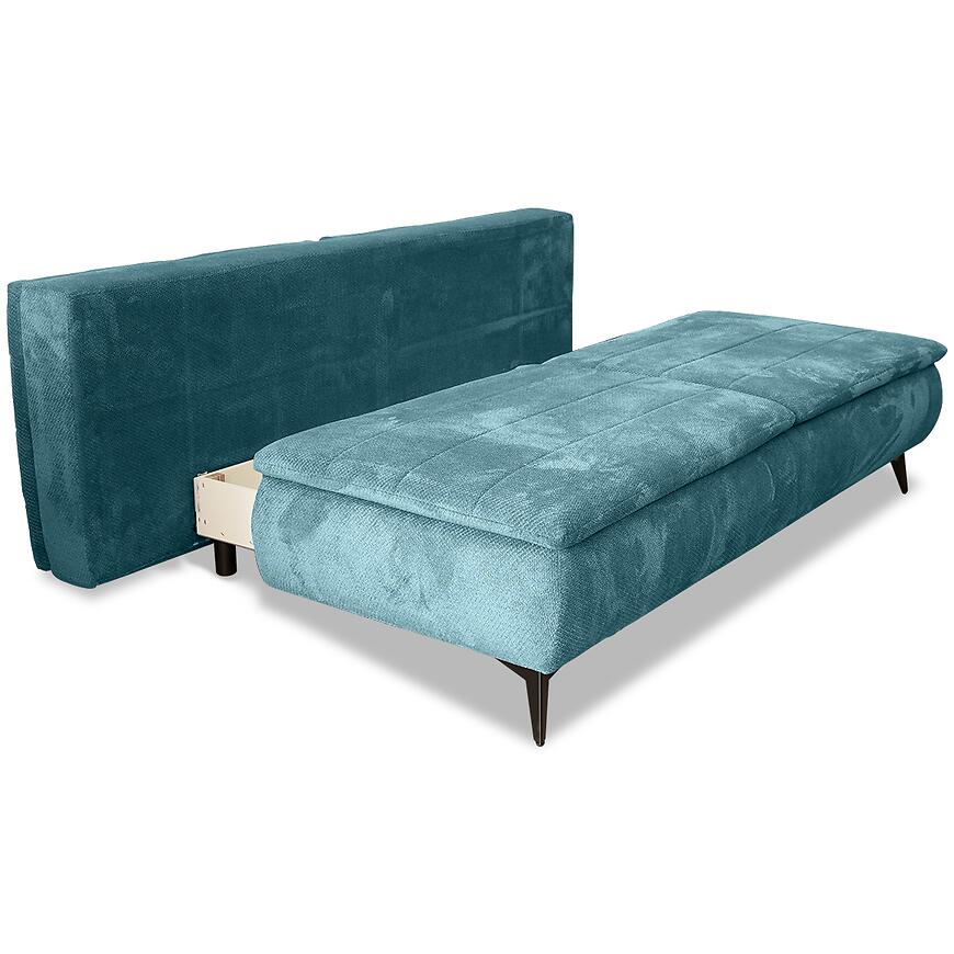 Turkusowa tkanina, prosta bryła i czarne nogi tworzą harmonijną całość, która świetnie komponuje się z wnętrzami urządzonymi w stylu nowoczesnym. Kanapa wymaga złożenia, jednak dołączone elementy pozwalają na szybki montaż.
