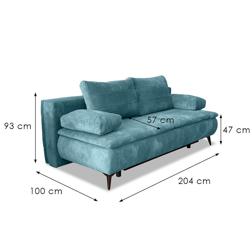 Kanapa Melly Vinci 87 to propozycja dla osób, które chcą połączyć komfort codziennego wypoczynku z wygodą dodatkowej przestrzeni do spania. Połączenie turkusowej tapicerki z czarnymi nogami tworzy efektowną i współczesną kompozycję, idealnie wpisującą się w estetykę nowoczesnych wnętrz. Szerokość 204 cm, głębokość 100 cm oraz wysokość 93 cm sprawiają, że sofa świetnie prezentuje się zarówno w większych, jak i bardziej kompaktowych przestrzeniach.