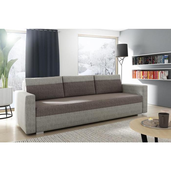 Sofa Mioveni z funkcją spania to wygoda i funkcjonalność. Sofa rozkładana z powierzchnią spania 136x200 cm zapewni komfortowy sen dla osób, które cenią sobie wypoczynek na kanapie, a także odpowiedni komfort podczas wypoczynku i siedzenia przed telewizorem. Sofa wykonana na stelażu drewnianym, a siedzisko i oparcie to połączenie płyty wiórowej i 9cm pianki T30. Kanapa z pojemnikiem to idealne rozwiązanie, które świetnie sprawdzi się w każdym pomieszczeniu. Mioveni to funkcjonalna sofa, którą możesz ustawić w salonie lub innym pomieszczeniu. Posiada tył obity materiałem, dzięki temu może stać wolno nawet na środku salonu.