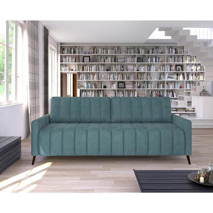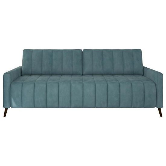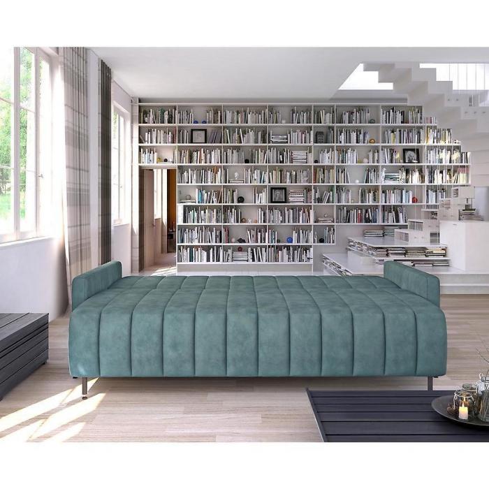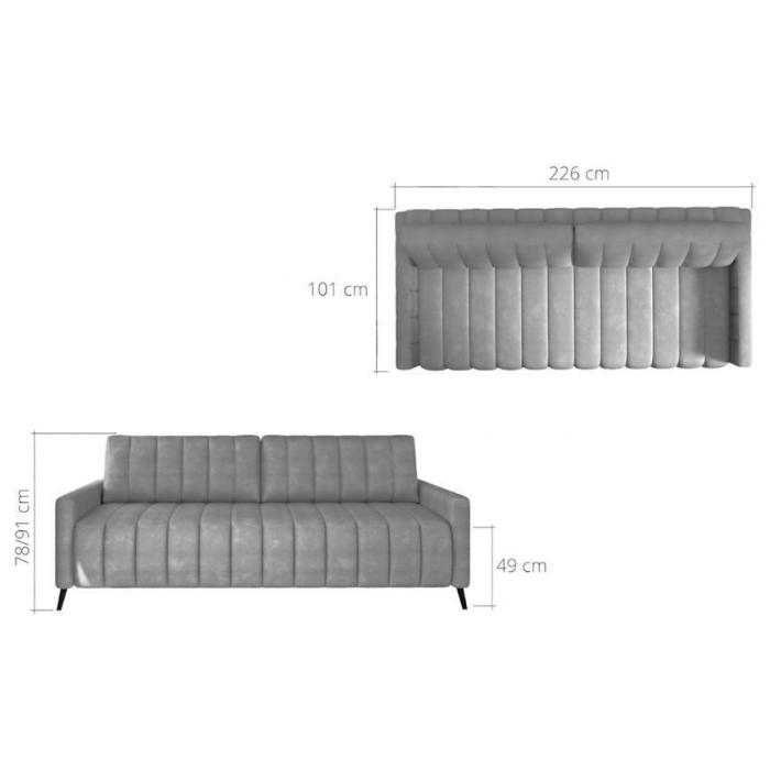 Obicie kanapy stanowi miła w dotyku, wytrzymała tkanina. Całość osadzona jest na metalowych czarnych nóżkach, które nie tylko zapewniają stabilizację mebla, ale też są ciekawym elementem dekoracyjnym. Delikatne przeszycia/pikowania sprawiają, że mebel nie wydaje się być monotonny i przykuwa uwagę. Świetnie tu sprawdzą się także tekstylne dodatki, które ocieplą kanapę, ale także całe pomieszczenie.