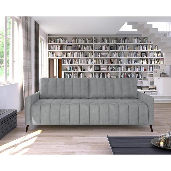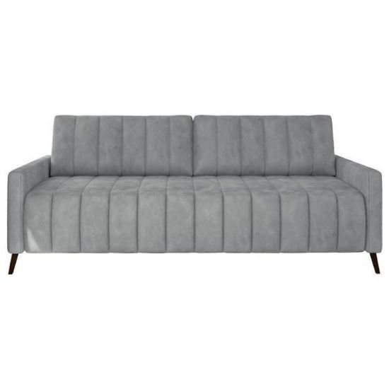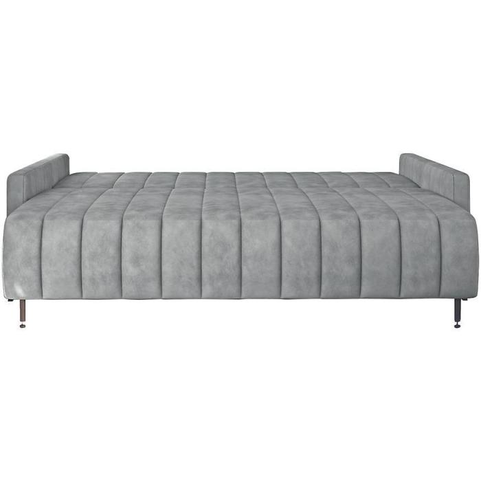 Obicie kanapy stanowi miła w dotyku, wytrzymała tkanina. Całość osadzona jest na metalowych czarnych nóżkach, które nie tylko zapewniają stabilizację mebla, ale też są ciekawym elementem dekoracyjnym. Delikatne przeszycia/pikowania sprawiają, że mebel nie wydaje się być monotonny i przykuwa uwagę. Świetnie tu sprawdzą się także tekstylne dodatki, które ocieplą kanapę, ale także całe pomieszczenie.