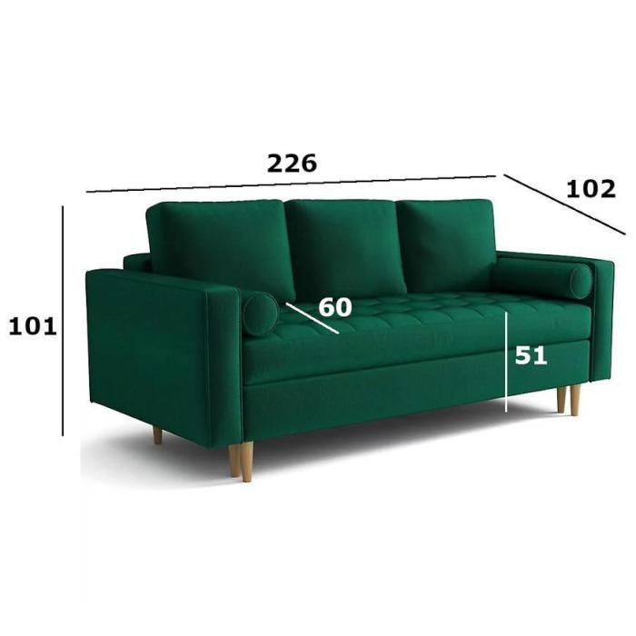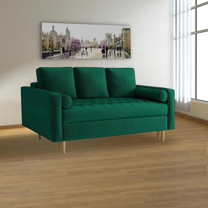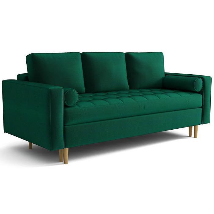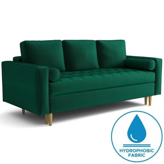 Kanapa Monza została wykończona w całości lekko połyskującą, miłą w dotyku i co najważniejsze hydrofobową tkaniną w modnym butelkowym kolorze. Hydrofobowe właściwości zapobiegają wchłanianiu wody przez tkaninę, sprawiając że ciecz skrapla się na powierzchni materiału. Kanapę wyposażono w pikowane siedzisko, dekoracyjne poduszki oraz charakterystyczne, wysokie nóżki - te detale sprawiają, że mebel świetnie wpisze się w eleganckie, ekskluzywne miejsca.