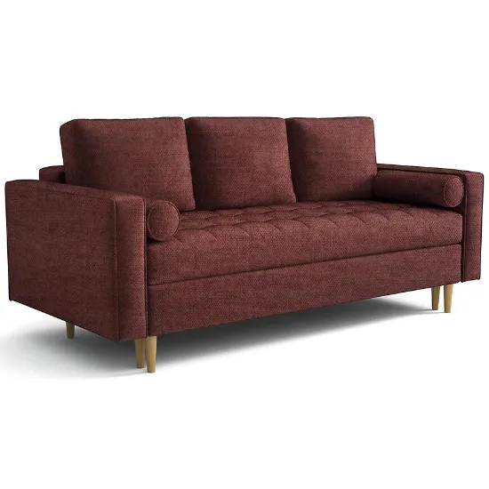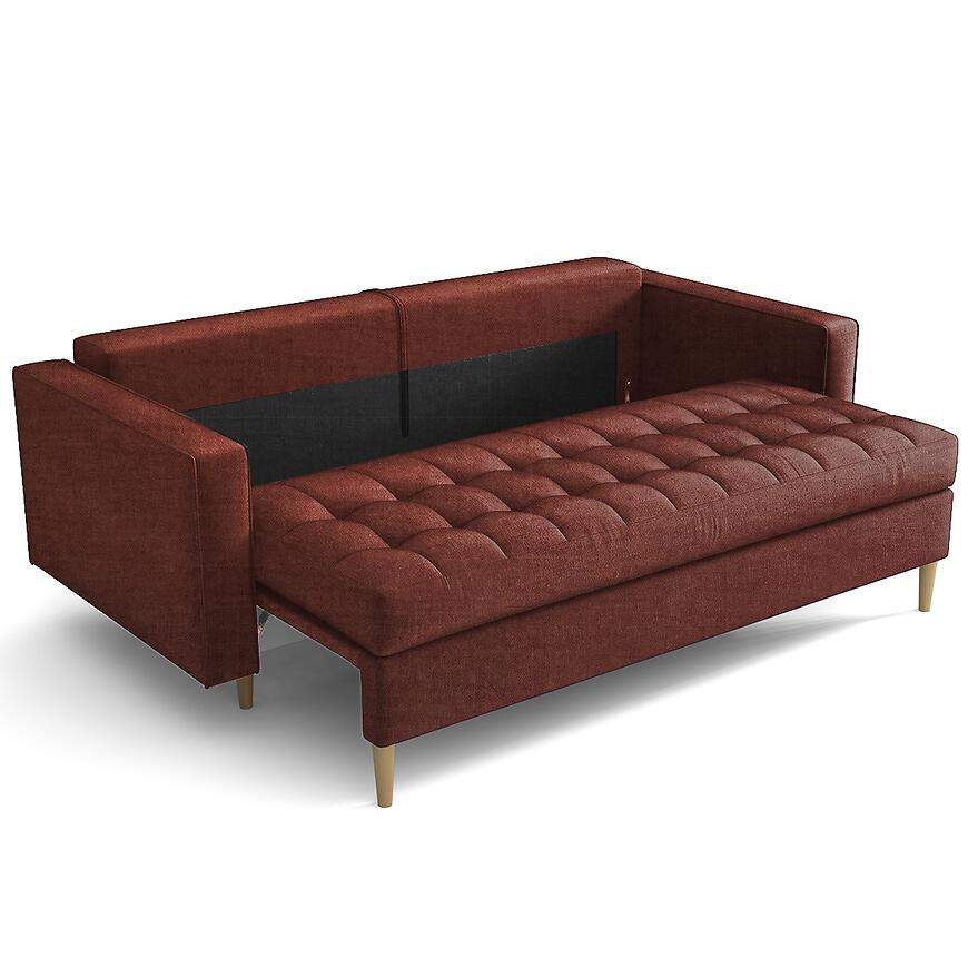 Siedzisko kanapy wykonano z połączenia sprężyny falistej i pianki HR, co gwarantuje wysoki komfort wypoczynku oraz trwałość mebla. Dodatkowym atutem jest pojemnik na pościel, który ułatwia przechowywanie kołder i poduszek, utrzymując porządek w pomieszczeniu. Tapicerka z tkaniny hydrofobowej nie tylko prezentuje się elegancko, ale także jest praktyczna – ogranicza wchłanianie płynów, co znacząco ułatwia czyszczenie i codzienne użytkowanie.