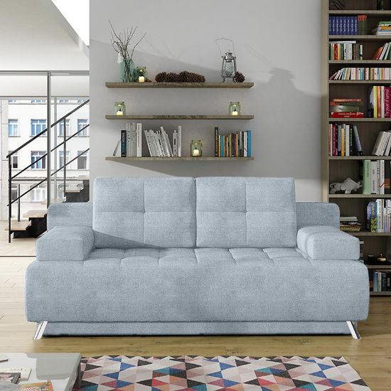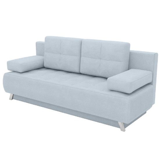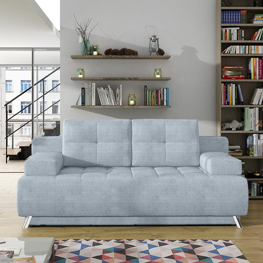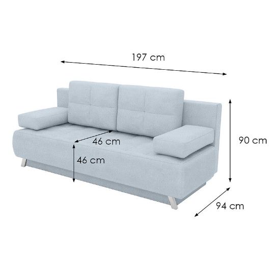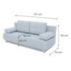 Wewnątrz kanapy znajduje się praktyczny schowek na pościel, który pozwala na przechowywanie koców, poduszek lub innych tekstyliów. Pojemnik jest obszerny, co dodatkowo zwiększa funkcjonalność mebla. Komfort siedzenia zapewnia sprężyna bonell, która równomiernie rozkłada ciężar i dostosowuje się do sylwetki, gwarantując wygodę.