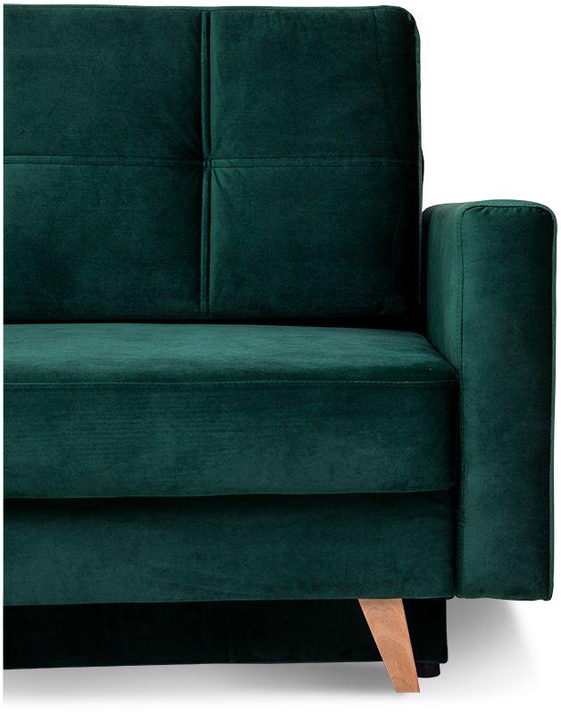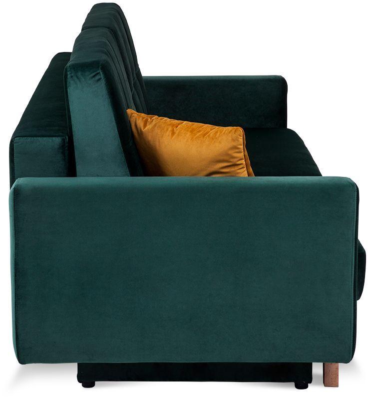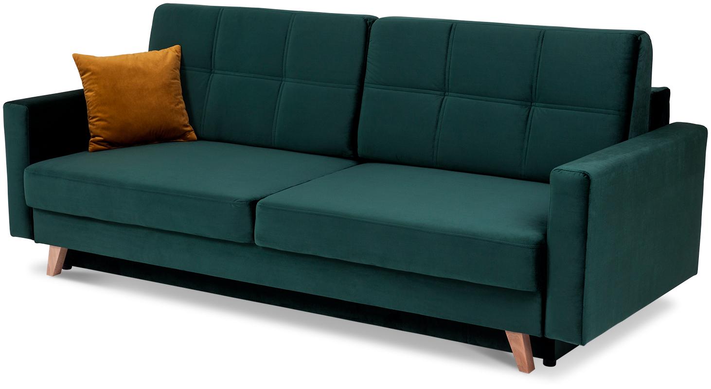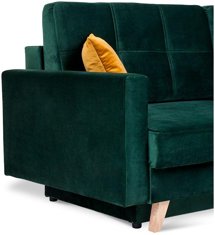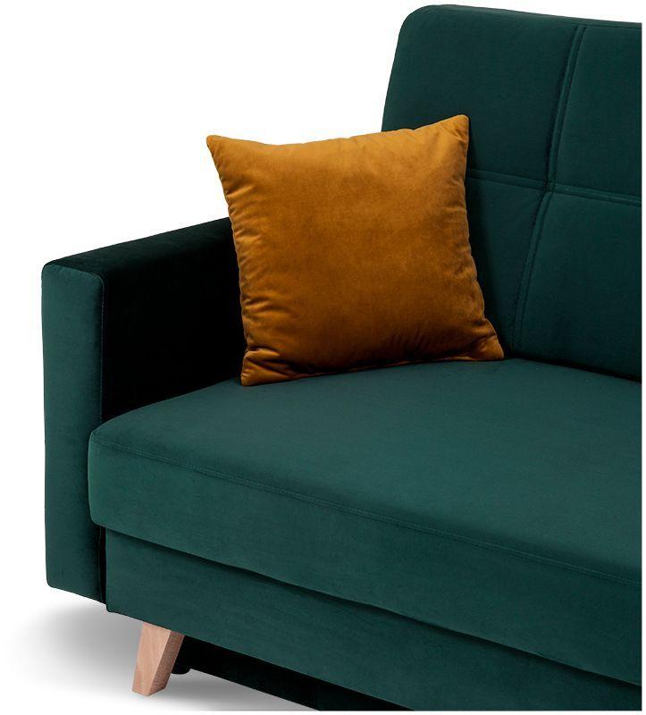 Kanapa Parma to wygodna sofa utrzymana w nowoczesnym stylu. Jej intensywny szmaragdowy kolor sprawia, że postawiona w salonie od razu przyciągnie wzrok, stanowiąc ciekawy akcent dekoracyjny. Prostą formę uzupełnia efektowny design poduszek oparciowych, dzięki czemu kanapa Parma nabiera subtelnej elegancji. Wykonane z jasnego drewna wysokie nóżki dopełniają całość, sprawiając, że model prezentuje się lekko, mimo dość sporych gabarytów. Kanapa Parma Abra to wysoce funkcjonalny mebel. Z wygodnej sofy może zmienić się w komfortowe łóżko dla dwóch osób, co zapewnia automat wspomagający rozkładanie DL. Dodatkowo pościel można umieścić w dużym i bardzo praktycznym pojemniku. Zastosowane w siedzisku sprężyny faliste oraz bonellowe w oparciu czynią odpoczynek jeszcze bardziej przyjemnym, a niewielka poduszka w musztardowym kolorze pełni funkcję dekoracyjną, dopełniając oryginalny design kanapy Parma. Oparcie to dwie stabilne poduszki oparciowe. W komplecie jedna mała ozdobna poduszka w kolorze musztardowym. Wysokość siedziska od podłogi 41 cm.