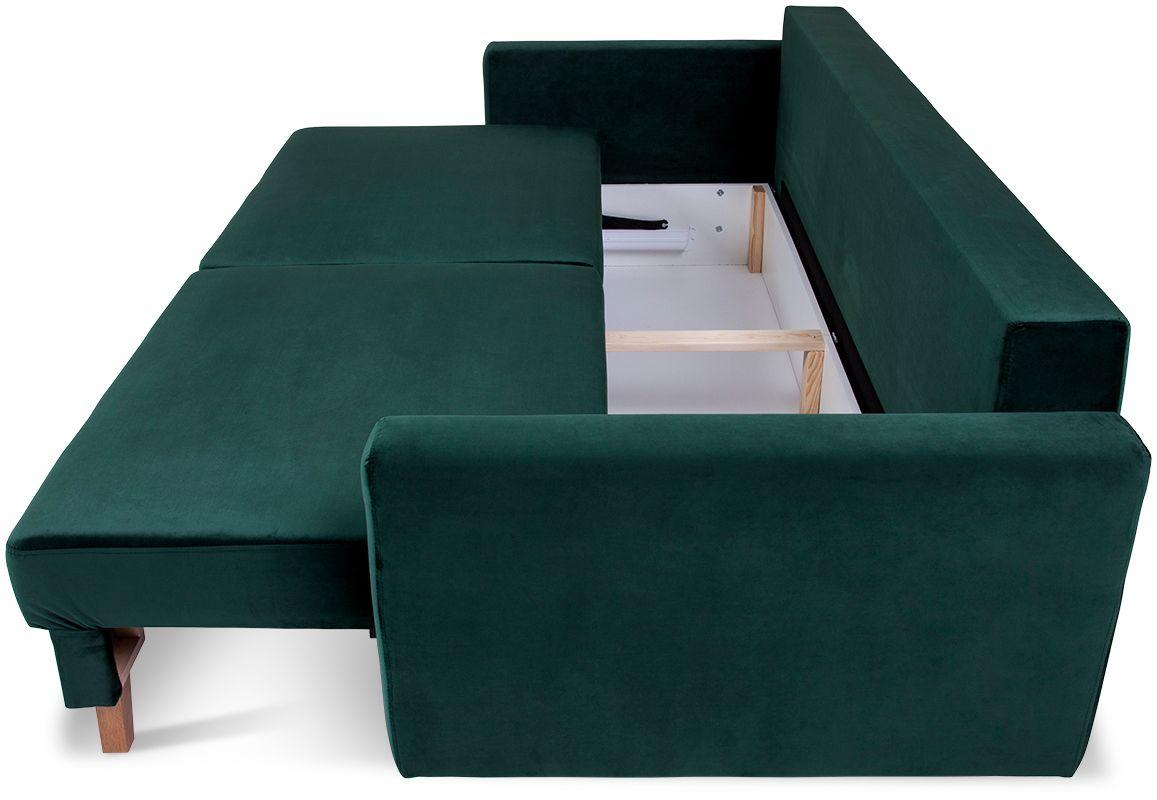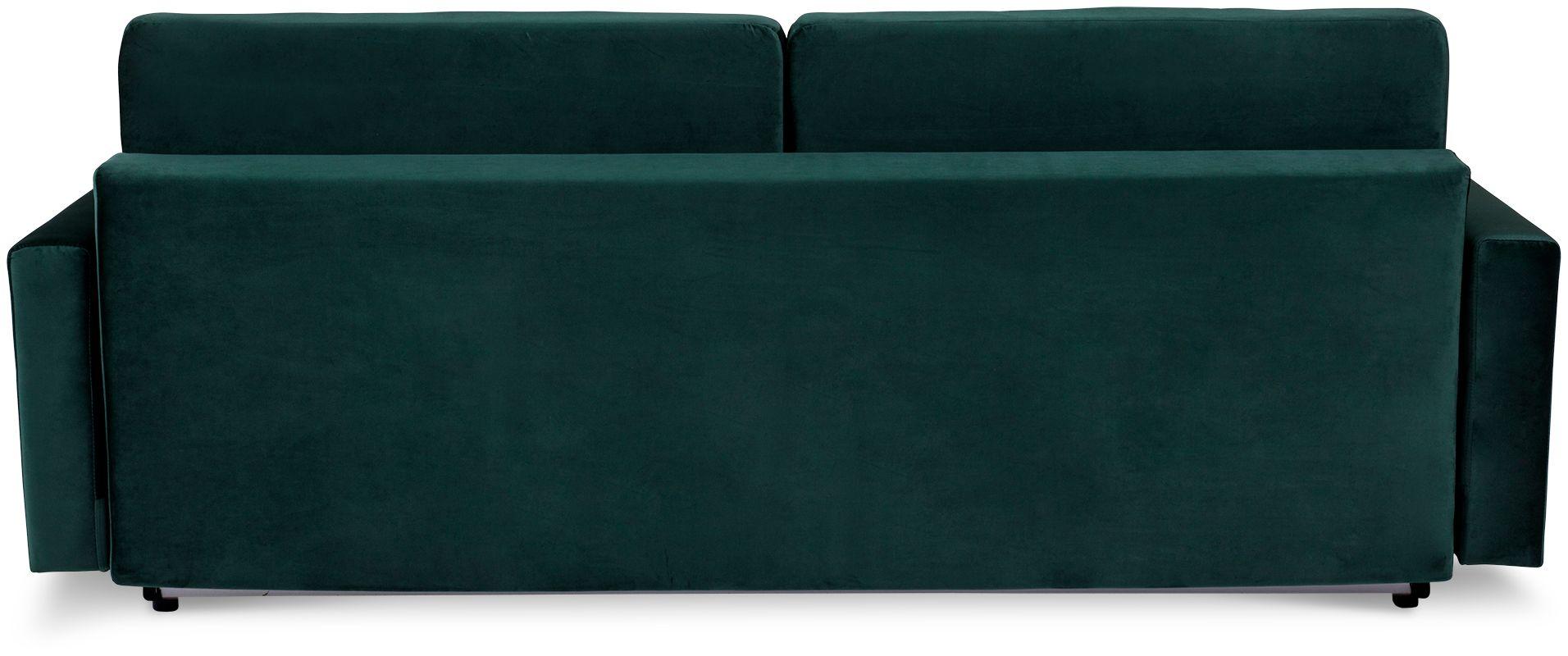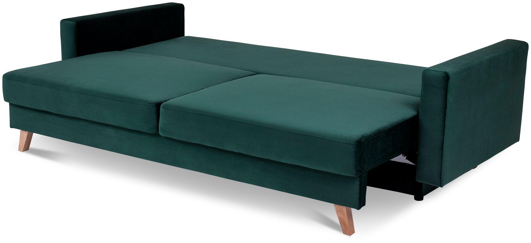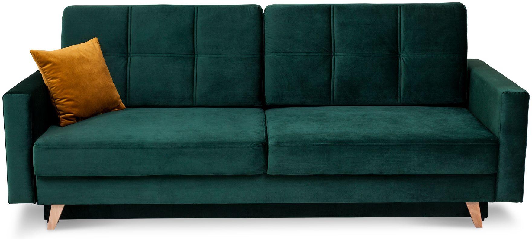 Kanapa Parma to wygodna sofa utrzymana w nowoczesnym stylu. Jej intensywny szmaragdowy kolor sprawia, że postawiona w salonie od razu przyciągnie wzrok, stanowiąc ciekawy akcent dekoracyjny. Prostą formę uzupełnia efektowny design poduszek oparciowych, dzięki czemu kanapa Parma nabiera subtelnej elegancji. Wykonane z jasnego drewna wysokie nóżki dopełniają całość, sprawiając, że model prezentuje się lekko, mimo dość sporych gabarytów. Kanapa Parma Abra to wysoce funkcjonalny mebel. Z wygodnej sofy może zmienić się w komfortowe łóżko dla dwóch osób, co zapewnia automat wspomagający rozkładanie DL. Dodatkowo pościel można umieścić w dużym i bardzo praktycznym pojemniku. Zastosowane w siedzisku sprężyny faliste oraz bonellowe w oparciu czynią odpoczynek jeszcze bardziej przyjemnym, a niewielka poduszka w musztardowym kolorze pełni funkcję dekoracyjną, dopełniając oryginalny design kanapy Parma. Oparcie to dwie stabilne poduszki oparciowe. W komplecie jedna mała ozdobna poduszka w kolorze musztardowym. Wysokość siedziska od podłogi 41 cm.