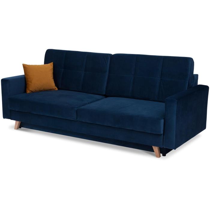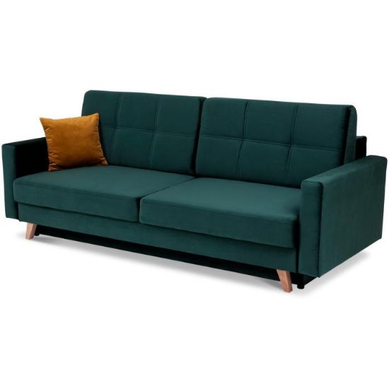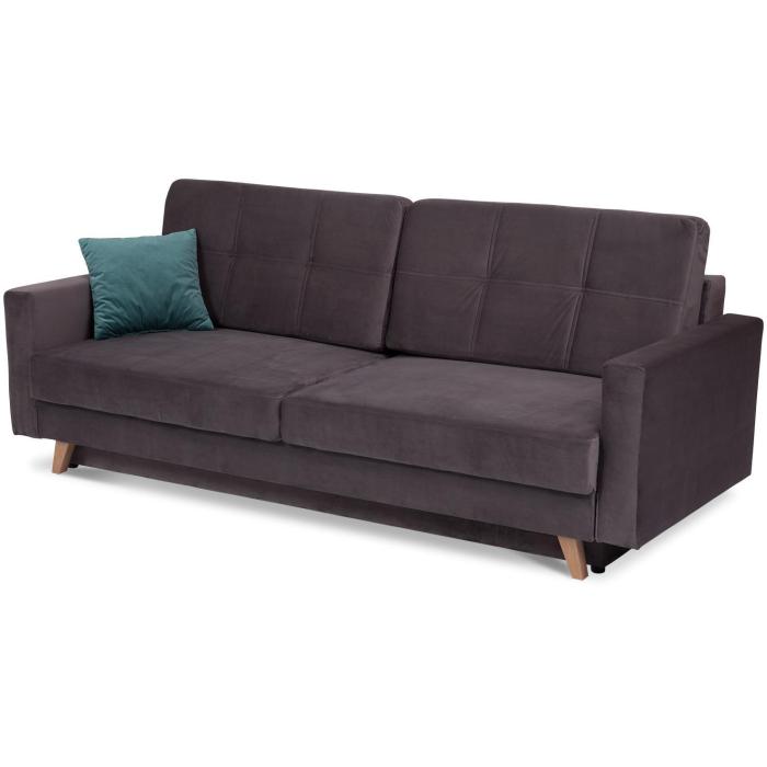 Kanapa Parma to wygodna sofa utrzymana w nowoczesnym stylu. Jej intensywny kolor sprawia, że postawiona w salonie od razu przyciągnie wzrok, stanowiąc ciekawy akcent dekoracyjny. Prostą formę uzupełnia efektowny design poduszek oparciowych, dzięki czemu kanapa Parma nabiera subtelnej elegancji. Wykonane z jasnego drewna wysokie nóżki dopełniają całość, sprawiając, że model prezentuje się lekko, mimo dość sporych gabarytów. Zastosowane w siedzisku sprężyny faliste oraz bonellowe w oparciu czynią odpoczynek jeszcze bardziej przyjemnym, a niewielka poduszka pełni funkcję dekoracyjną, dopełniając oryginalny design kanapy Parma. Z wygodnej sofy może zmienić się w komfortowe łóżko dla dwóch osób, co zapewnia automat wspomagający rozkładanie DL. Dodatkowo pościel można umieścić w dużym i bardzo praktycznym pojemniku. Kanapa wykonana w tkaninie Monolith o podwyższonych właściwościach. Tkanina pokryta jest specjalną warstwą ochronną, tworząca hydrofobową powłokę zabezpieczającą przed szybkim przesiąkaniem płynów. Zapobiega to natychmiastowemu absorbowaniu wody przez tkaninę, sprawiając że ciecz skrapla się na powierzchni materiału.