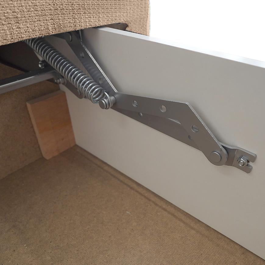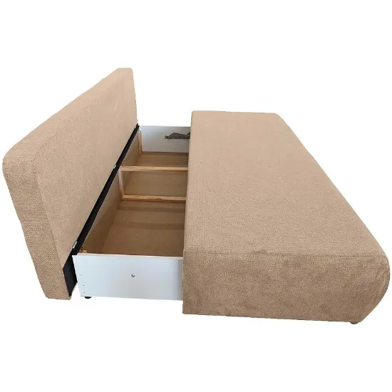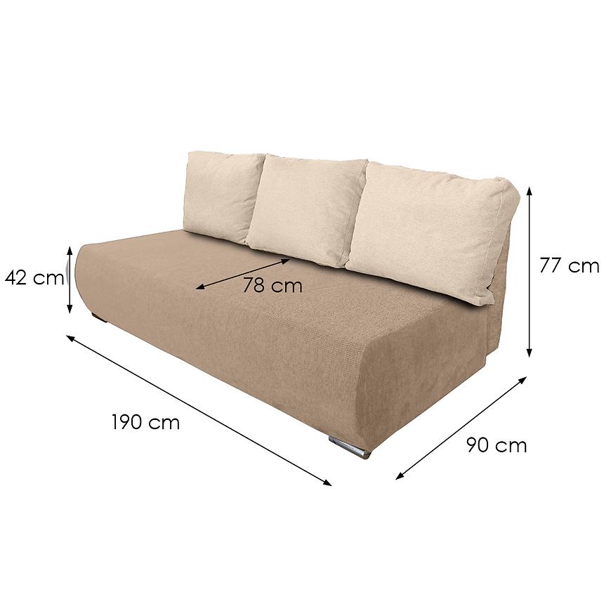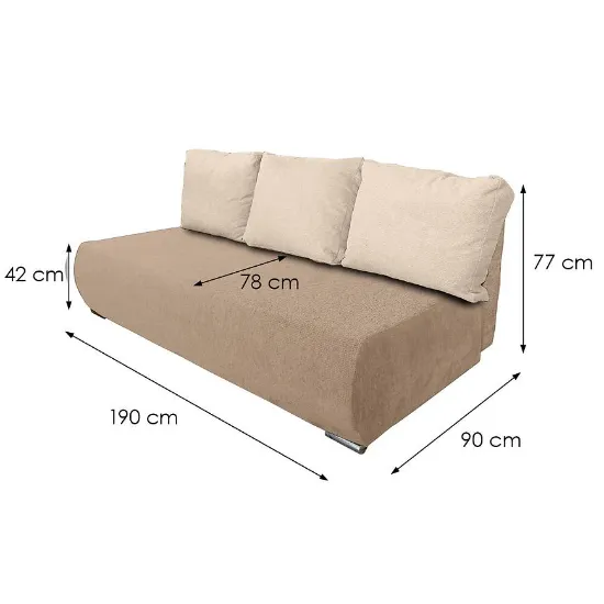 Dodatkowym atutem jest pojemny schowek na pościel, który ułatwia przechowywanie koców i poduszek. W zestawie znajdują się również poduszki oparciowe, zwiększające komfort odpoczynku. Głębokość siedziska wynosi 76 cm, wysokość siedziska od podłogi - 42 cm.