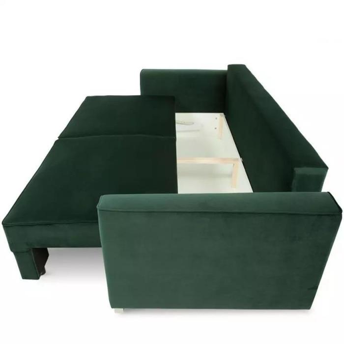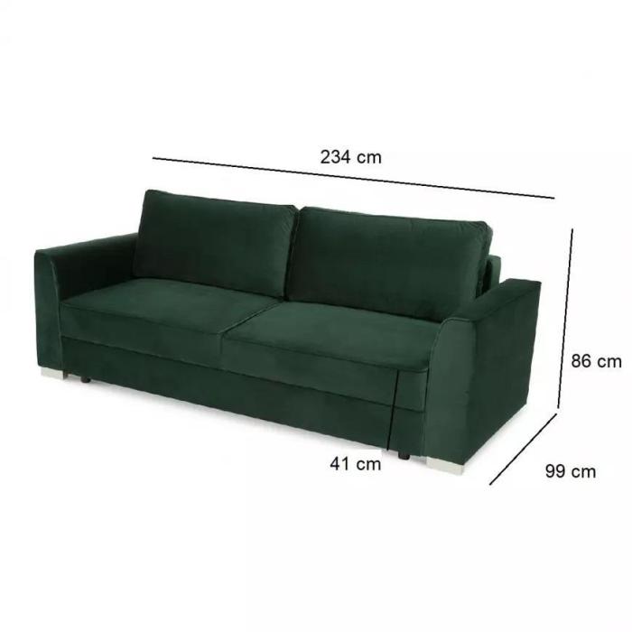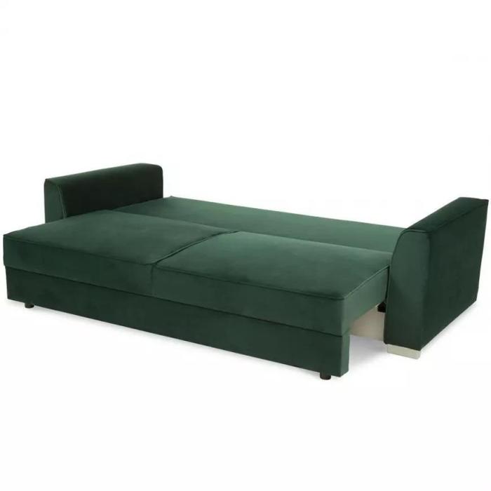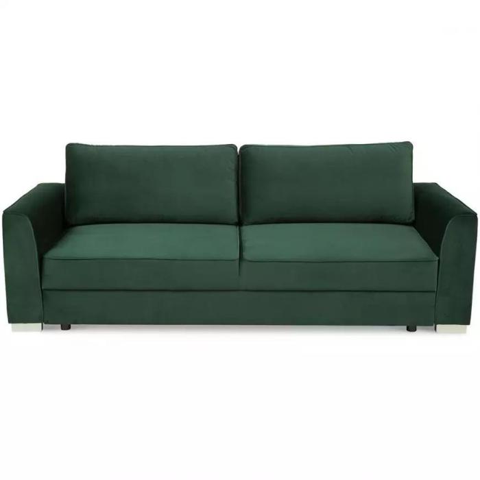 Trzyosobowa kanapa rozkładana z funkcją spania, pojemnikiem na pościel. W komplecie dwie zdejmowane poduszki oparciowe. Sofa wykonana jest w tkaninie Riviera w kolorze zielonym. W meblu zastosowano sprężyny bonell oraz sprężyny faliste. W sofie zastosowano nóżki w kolorze srebrnym wykonane z tworzywa. Kanapa Poli jest wykonana z dużą precyzją co zapewnia estetyczny, stylowy wygląd.