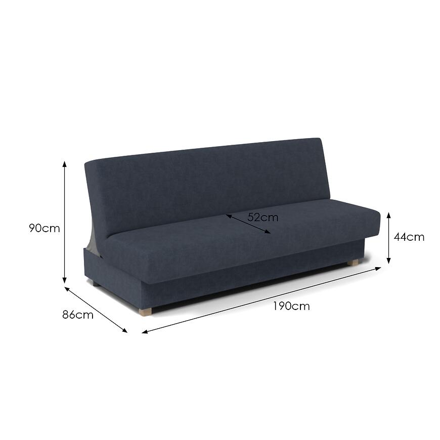 Kanapa ma 190 cm szerokości, 86 cm głębokości oraz 90 cm wysokości, co pozwala zachować proporcje przy jednoczesnym zapewnieniu funkcji spania. Kanapa nie wymaga złożenia, gotowa do użycia od razu po dostawie.