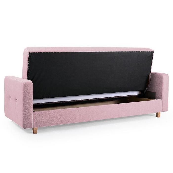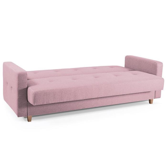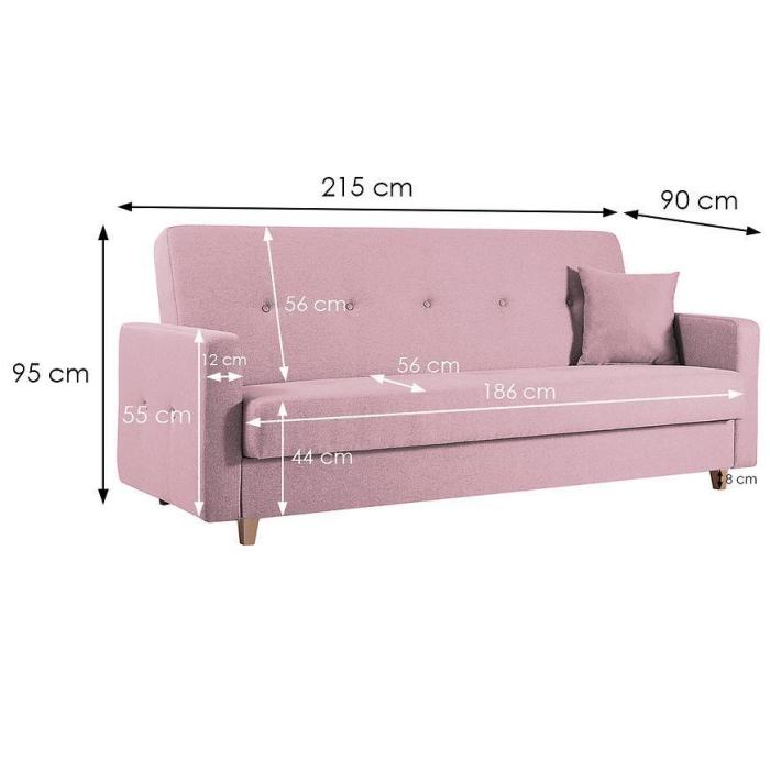 Kanapa Tango w kolorze różowym to praktyczny i stylowy mebel zaprojektowany z myślą o nowoczesnych wnętrzach. Posiada funkcję okazjonalnego spania oraz praktyczny pojemnik na pościel. Po rozłożeniu oferuje powierzchnię 122x190 cm, a jej prosty system rozkładania typu wersalkowego zapewnia wygodę użytkowania. Wypełnienie ze sprężyny falistej zwiększa komfort siedzenia i odpoczynku. Kanapa doskonale sprawdzi się w salonie lub pokoju dziennym, tworząc wygodną przestrzeń do relaksu i spotkań.