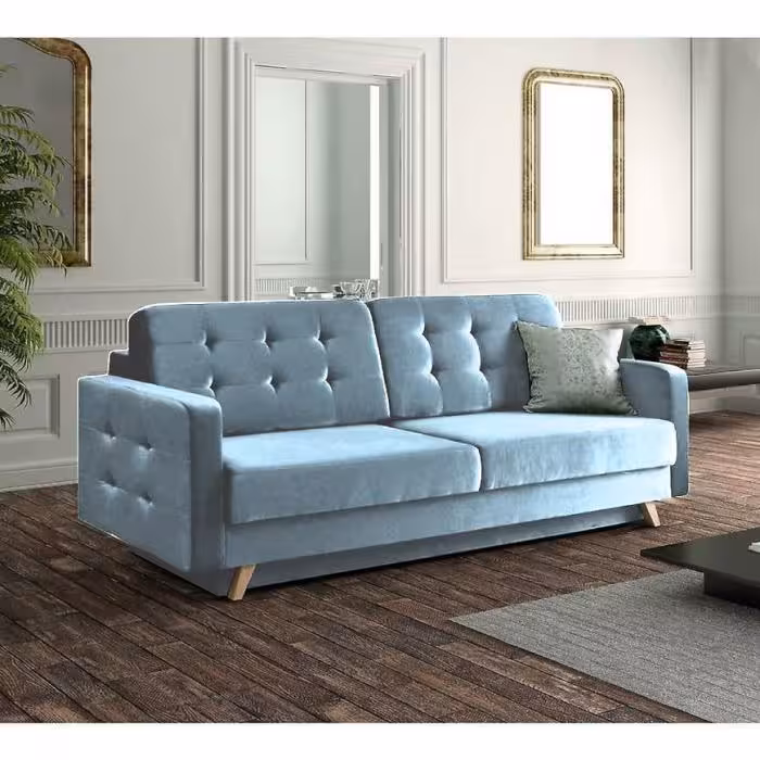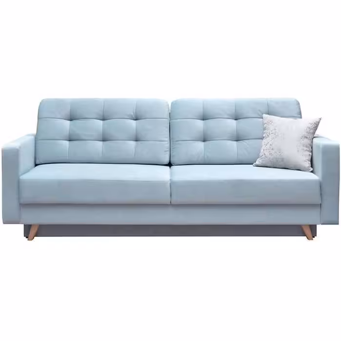Kanapa Vegas to praktyczna i funkcjonalna kanapa zaprojektowana w nowoczesnym stylu. Mebel ten posiada funkcję spania oraz praktyczny pojemnik na pościel. Kanapa Vegas posiada automat wspomagający rozkładnie, dzięki czemu w łatwy i szybki sposób przygotujemy miejsce do spania. Po rozłożeniu powierzchnia spania wynosi 140x200cm. Nogi kanapy zaprojektowane w kolorze jasnym – drewnopodobnym stanowią element dekoracyjny całej kompozycji. Wypełnienie siedziska oraz oparcia mebla stanowią sprężyny bonellowe + falista, które zwiększają komfort podczas codziennego użytkowania. Kanapa Vegas to klasyczna forma z pikowanym oparciem i bokami, które stanowią elementy dekoracyjne całej konstrukcji. Wykonana z bardzo miękkiej i solidnej tkaniny. Świetnie sprawdzi się zarówno w salonie jak i pokoju dziennym, pełniąc funkcję miejsca spotkań. Kanapa jest dostępna również w pozostałych wersjach kolorystycznych.