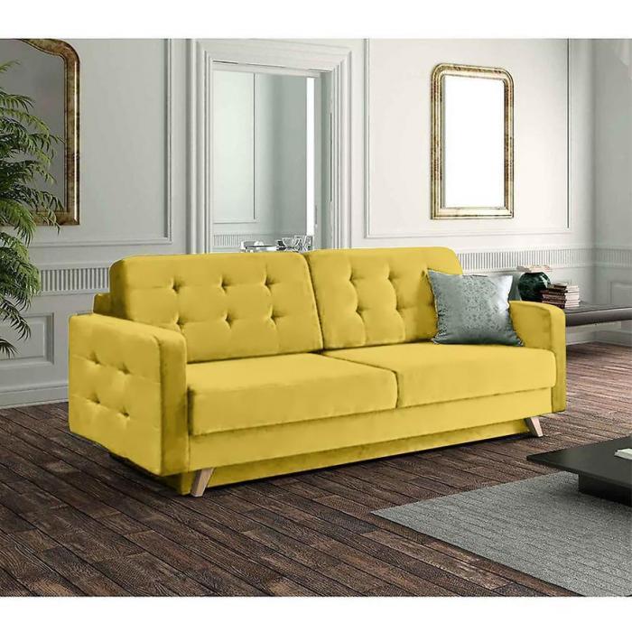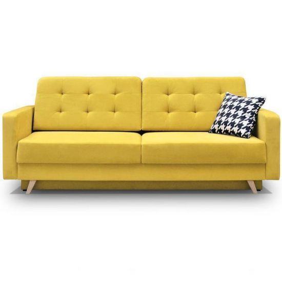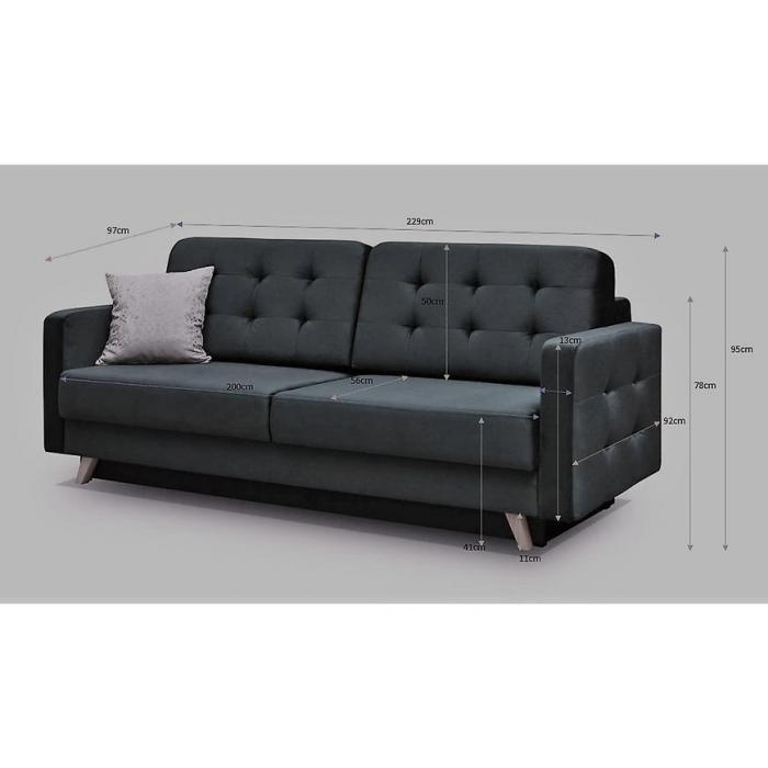 Kanapa Vegas to praktyczna i funkcjonalna kanapa zaprojektowana w nowoczesnym stylu. Mebel ten posiada funkcję spania oraz praktyczny pojemnik na pościel. Kanapa Vegas posiada automat wspomagający rozkładnie, dzięki czemu w łatwy i szybki sposób przygotujemy miejsce do spania. Po rozłożeniu powierzchnia spania wynosi 140x200cm. Nogi kanapy zaprojektowane w kolorze jasnym – drewnopodobnym stanowią element dekoracyjny całej kompozycji. Kanapa Vegas to klasyczna forma z pikowanym oparciem i bokami, które stanowią elementy dekoracyjne całej konstrukcji. Wykonana z bardzo miękkiej i solidnej tkaniny. Świetnie sprawdzi się zarówno w salonie jak i pokoju dziennym, pełniąc funkcję miejsca spotkań.