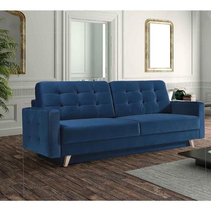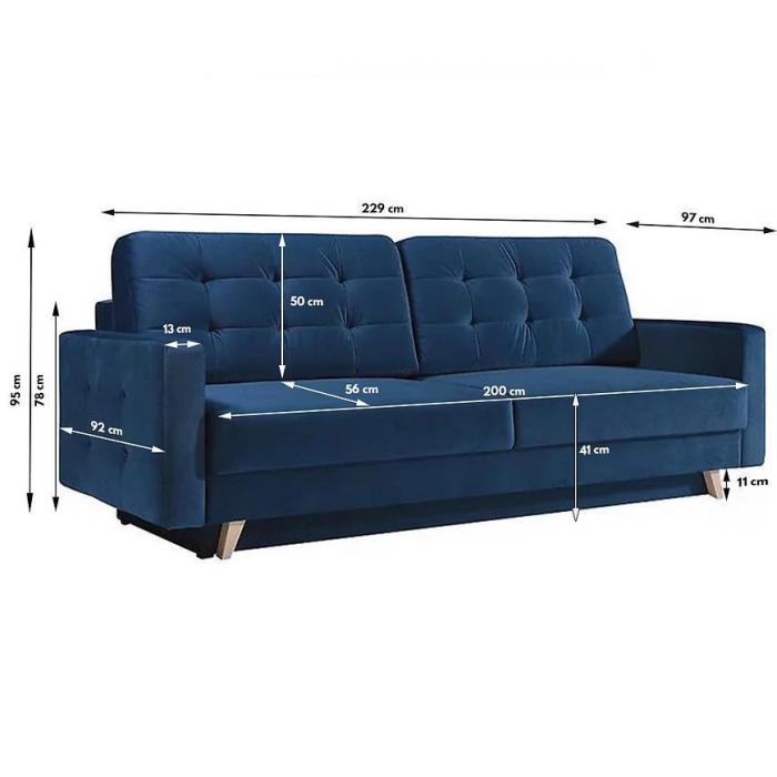 Kanapa Vegas Kronos 09 to praktyczna i funkcjonalna kanapa zaprojektowana w nowoczesnym stylu. Mebel ten posiada funkcję spania oraz praktyczny pojemnik na pościel. Kanapa Vegas posiada automat wspomagający rozkładnie, dzięki czemu w łatwy i szybki sposób przygotujemy miejsce do spania. Po rozłożeniu powierzchnia spania wynosi 140x200cm. Nogi kanapy zaprojektowane w kolorze jasnym stanowią element dekoracyjny całej kompozycji. Kanapa Vegas Kronos to klasyczna forma z pikowanym oparciem i bokami w kolorze granatowym, które stanowią elementy dekoracyjne całej konstrukcji. Wykonana z bardzo miękkiej i solidnej tkaniny w kolorze granatowym. Świetnie sprawdzi się zarówno w salonie jak i pokoju dziennym, pełniąc funkcję miejsca spotkań. Kanapa jest dostępna również w pozostałych wersjach kolorystycznych. Z pewnością wpisze się w większość domowych aranżacji.
