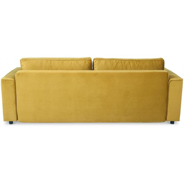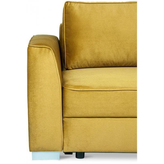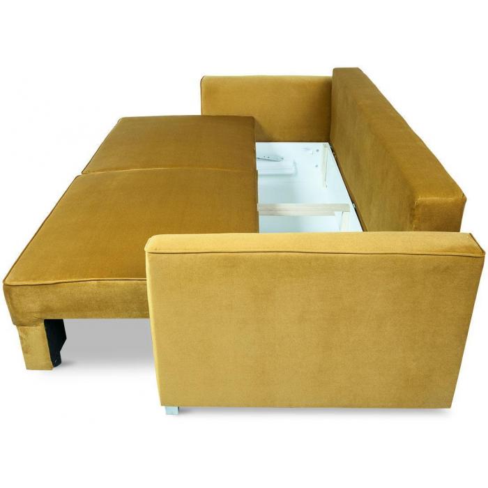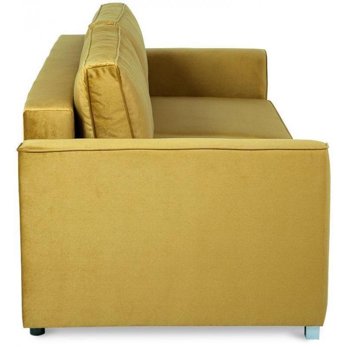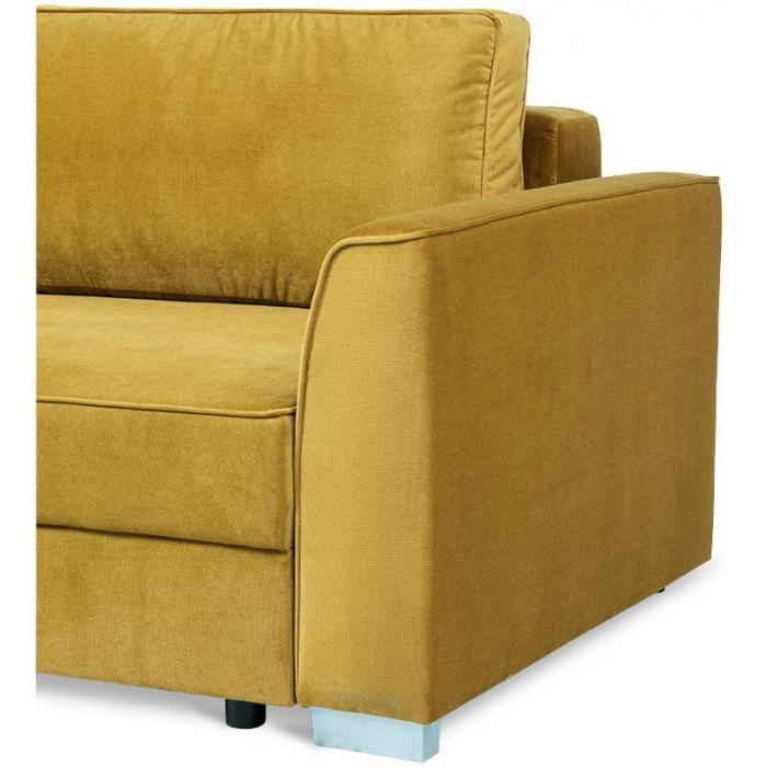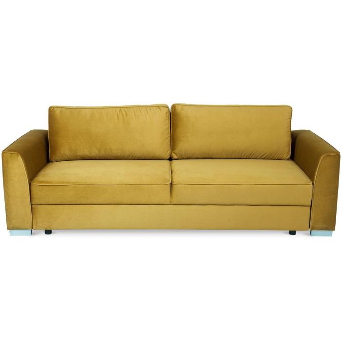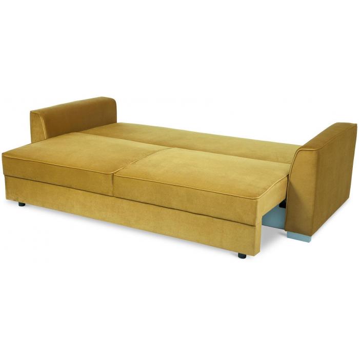 Trzyosobowa kanapa Venus z funkcją spania. W komplecie kanapa posiada dwie poduszki oparciowe. Mebel wykonany w tkaninie Kronos w kolorze musztardowym. W siedzisku mebla zastosowano sprężyny faliste, w oparciu sprężyny bonellowe. Kanapa Venus posiada mechanizm ułatwiający rozkładanie oraz pojemnik na pościel. Po rozłożeniu sofy otrzymujemy powierzchnię spania o wymiarach 153x196 cm. W kanapie zastosowano popularny mechanizm rozkładania - DL. Nóżki plastikowe - satynowe.