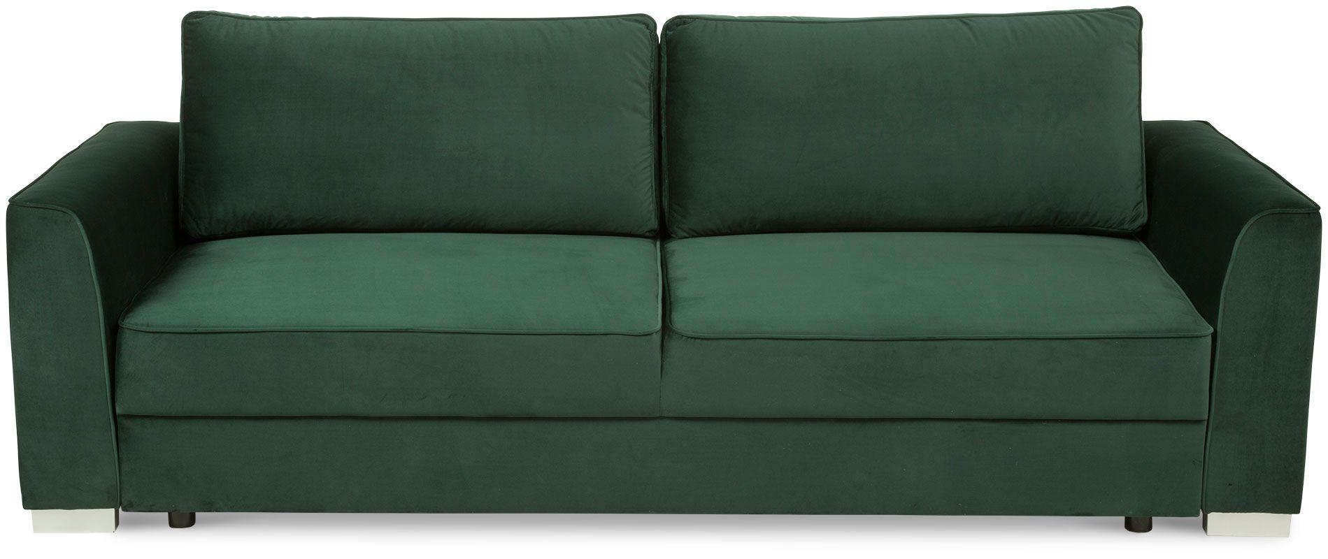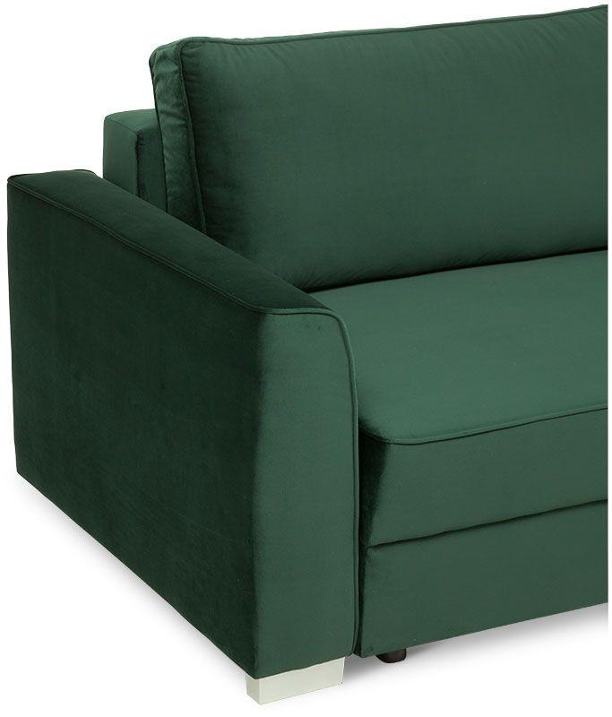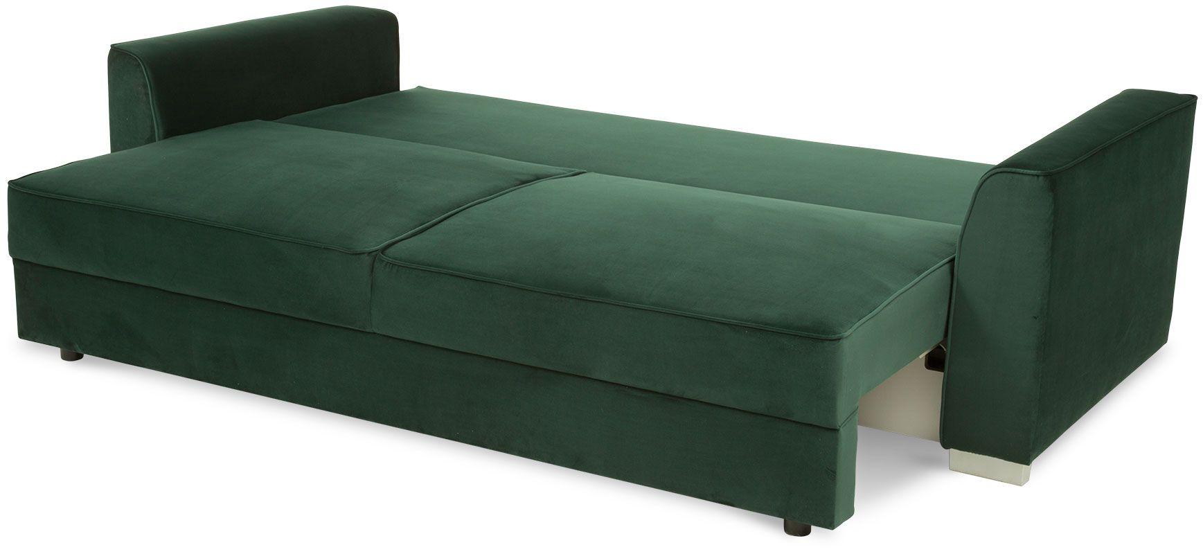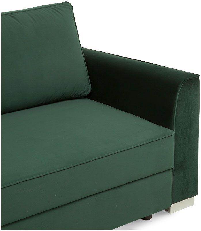 Kanapa Wenus to super wygodna i nowoczesna komoda w kolorze ciemnej zieleni. Komoda Wenus to 3 osobowy mebel z funkcją spania i mechanizmem ułatwiającym rozkładanie. Mebel ten posiada w komplecie 2 poduszki oparciowe. Kanapa ta posiada obicie miękką i przyjemną w dotyku tkaniną velver Rviera w stylowym kolorze ciemnej zieleni. Kanapa świetnie wpisze się w nowoczesne wnętrza w industrialnym czy minimalistycznym stylu. W siedzisku mebla zastosowano sprężyny faliste, w oparciu sprężyny bonellowe, które zwiększają komfort codziennego użytkowania zarówno w dzień jak i w nocy.. Mebel ten rozkłada się w bardzo prosty i szybki sposób, bez problemy można zamienić codzienną kanapę w nocne, wygodne łóżko do spania. Po rozłożeniu powierzchnia spania wynosi 153 cm x 196 cm, podobnie jak w dwuosobowym łóżku. Element dekoracyjny stanowi cienka, obszyta lamówka zarówno w poduszkach oparciowych jak i bryle kanapy. Kanapa dostępna w dwóch wariantach kolorystycznych: brąz oraz ciemna zieleń. Z pewnością każdy znajdzie coś dla siebie.