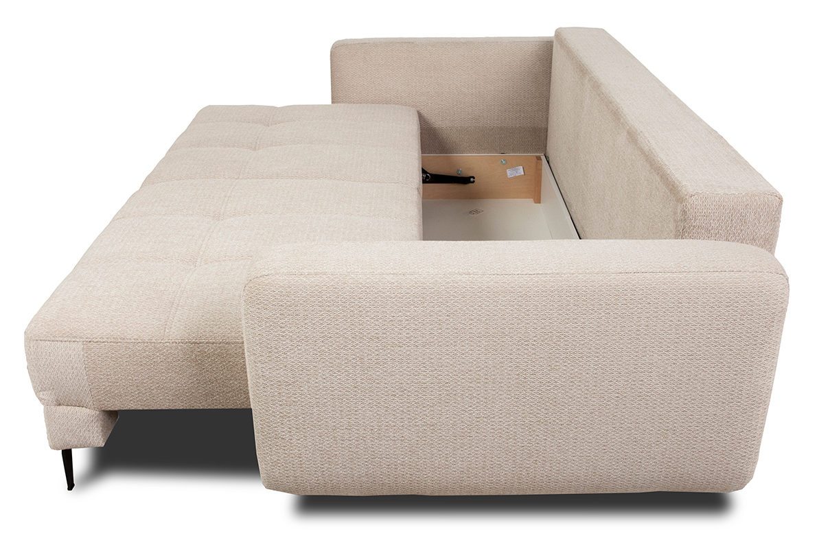 Nesso została wykonana z wysokiej jakości tkaniny Retro Bliss w eleganckim ciemnego beżu. Jest to tkanina miękka i miła w dotyku o bardzo wyrazistej strukturze. Tkanina ta jest nie tylko trwała i łatwa w utrzymaniu czystości, ale także nadaje kanapie nowoczesny i stylowy wygląd. Nóżki metalowe z przodu w kolorze czarnym dodają kanapie elegancji i stabilności, podczas gdy nóżki z tworzywa sztucznego pod pojemnikiem na pościel zapewniają dodatkową wytrzymałość i stabilność.