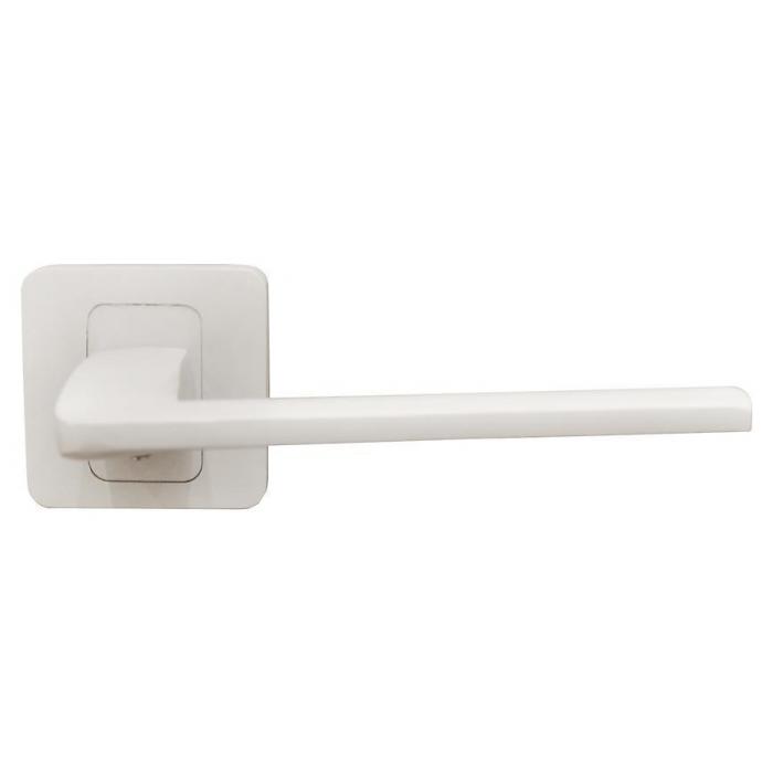Klamka Bianco E46R biała do drzwi wewnętrznych. Kwadratowa rozeta i eleganckie wykończenie sprawiają, że pasuje do nowoczesnych wnętrz.