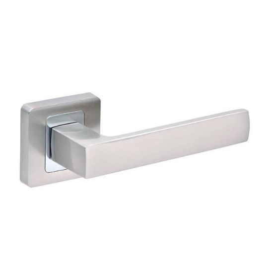 Klamka drzwiowa TOMA R62 w kolorze nikiel/satyna/chrom do drzwi wewnętrznych. Kwadratowa rozeta i elegancki design idealny do nowoczesnych wnętrz.