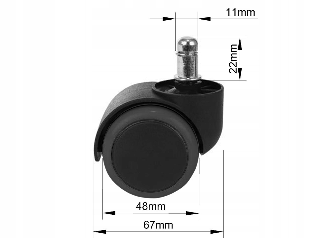 Produkt jest w kolorze czarnym, nie posiada podłokietników ani funkcji regulacji wysokości, co czyni go prostym i funkcjonalnym dodatkiem. Montaż kółek jest szybki i wymaga złożenia, dzięki czemu możesz je łatwo dopasować do większości standardowych foteli obrotowych.