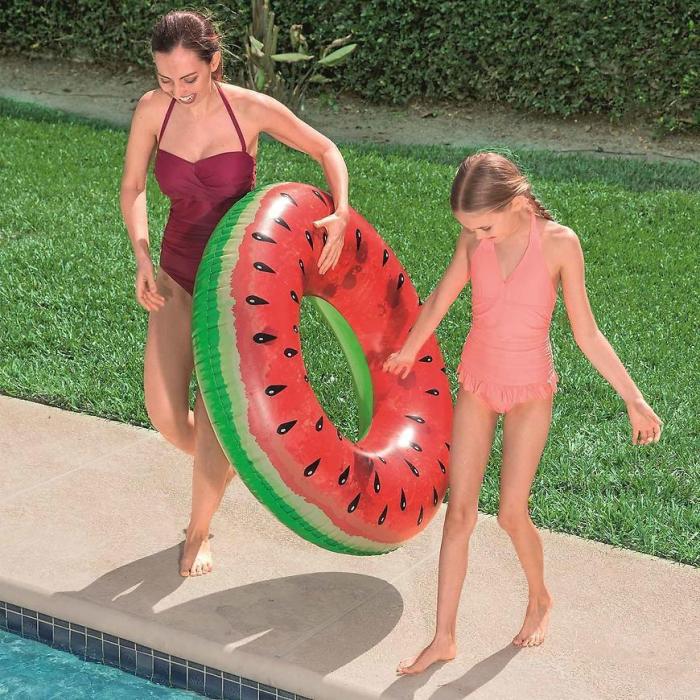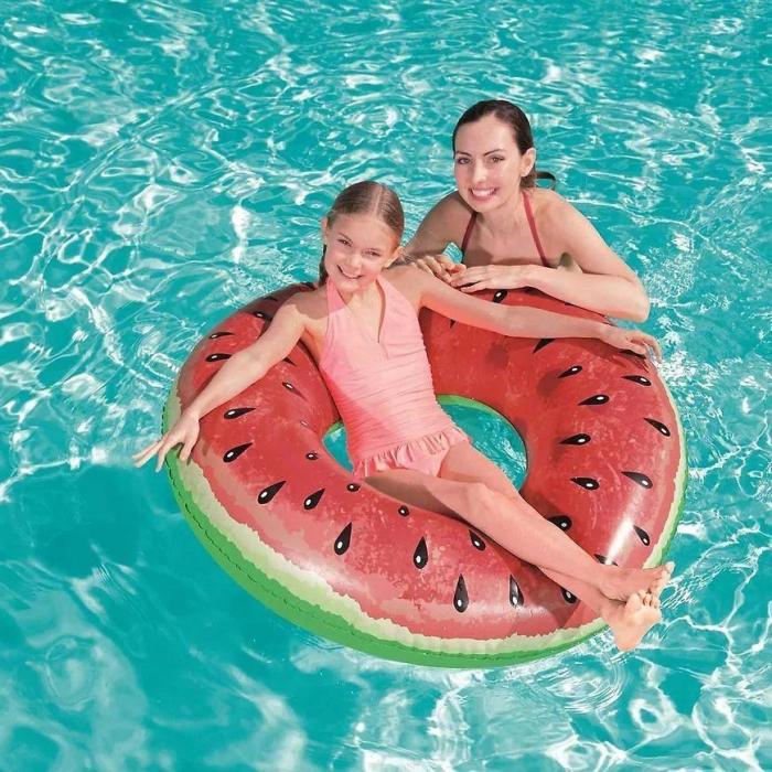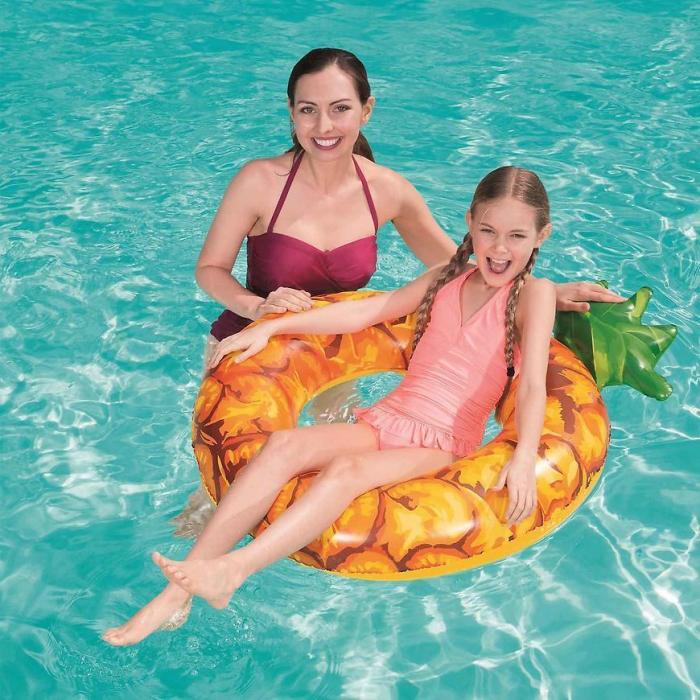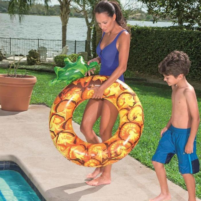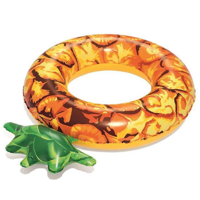 Koło do pływania w kształcie ananasa lub arbuza, pozwala na chwilę relaksu i odpoczynku, a także do nauki w basenie. Jest przeznaczona dla wieku 12+, rozmiar ananasa116x88cm, rozmiar arbuza 119cm. W zestawie łatka naprawcza.