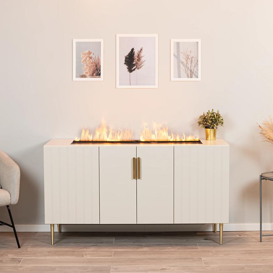 Kominek elektryczny Prins 1000 R beż to elegancki model w stylu glamour, wykończony w matowym odcieniu beżu. Zastosowany efekt płomienia Dimplex Cassette 1000 Retail Opti-Myst® zapewnia niezwykle realistyczną wizualizację ognia przy poborze energii 450 W. Kominek nie posiada funkcji grzewczej, dzięki czemu pełni głównie rolę dekoracyjną i nastrojową. Wyposażony jest w technologię LED, praktyczne miejsce do przechowywania oraz emulator dźwięku. Sterowanie ułatwia pilot zdalnego sterowania. Wymiary 780 × 1400 × 500 mm, waga 56 kg – solidny i stylowy element aranżacji wnętrza.