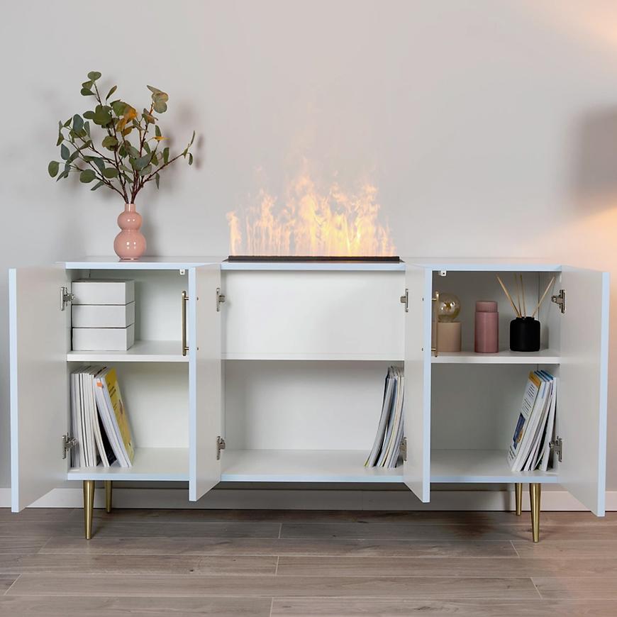 Kominek elektryczny Prins 500 w wykończeniu Baby Blue mat to elegancki i designerski element wnętrza w stylu glamour, łączący nowoczesny wygląd z funkcjonalnością. Matowa, niebieska powierzchnia nadaje wnętrzu subtelny i świeży charakter, wprowadzając oryginalny akcent dekoracyjny. Kominek wyposażony jest w technologię Dimplex Opti-Myst® z serii Projects, która generuje realistyczny efekt płomienia dzięki połączeniu pary wodnej i energooszczędnego podświetlenia LED, pozwalając cieszyć się nastrojową atmosferą ognia przez cały rok, bez funkcji grzewczej. Urządzenie posiada wbudowane miejsce do przechowywania oraz emulator dźwięku, który wzbogaca wrażenia wizualno-słuchowe. Obsługa kominka jest łatwa dzięki dołączonemu pilotowi zdalnego sterowania. Solidna konstrukcja o wymiarach 780 × 1400 × 500 mm i wadze 50 kg gwarantuje stabilność i trwałość, czyniąc Prins 500 Baby Blue mat eleganckim i praktycznym rozwiązaniem do każdego nowoczesnego wnętrza.