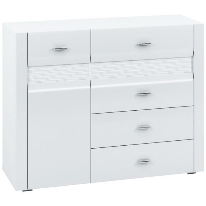 Doskonałym wyborem do pokoju dziennego będzie biała komoda z serii Arko, materiał wykonania to płyta MDF/płyta meblowa. Komoda posiada drzwiczki szuflady, dzięki czemu ma łatwy dostęp do wnętrza. Komoda dopełni również wystrój salonu, czy przedpokoju, stanowiąc wygodne miejsce do przechowywania mniejszych i większych rzeczy. Mebel do samodzielnego montażu.