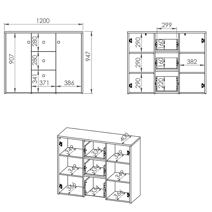 Dwudrzwiowa komoda 120 Elmo posiada zamykane półki oraz trzy praktyczne szuflady, co daje mnóstwo miejsca do przechowywania różnych rzeczy, od ubrań po dokumenty czy przedmioty dekoracyjne.