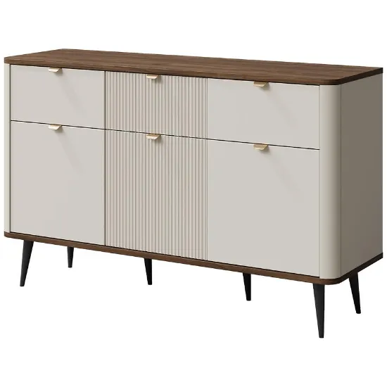 Komoda Marly 10 o szerokości 130 cm w ciepłej kolorystyce Orzech/Kashmir to funkcjonalny mebel z trzema szafkami i trzema szufladami. Idealny do salonu, sypialni czy przedpokoju, łączy nowoczesny design z praktycznym przechowywaniem.