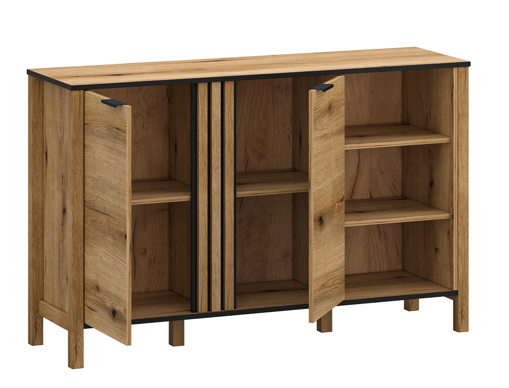Komoda dwudrzwiowa z drzwiami uchylnymi to nie tylko eleganckie rozwiązanie, ale także praktyczne, zapewniające łatwy dostęp do przechowywanej zawartości. Cztery półki wykonane z trwałej płyty meblowej umożliwiają uporządkowane przechowywanie, idealne dla tych, którzy cenią sobie porządek.