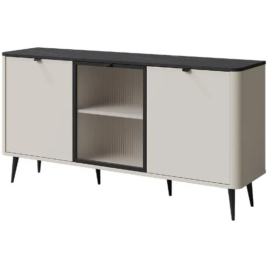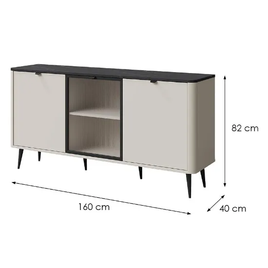 Komoda Marly 7 o szerokości 160 cm to nowoczesny i funkcjonalny mebel z trzema zamykanymi szafkami. Wykończona w eleganckich kolorach Kashmir i Szary Kamień, doskonale wpasuje się w wystrój salonu, sypialni lub jadalni. Idealna do przechowywania i organizacji domowych przedmiotów.