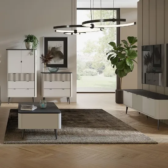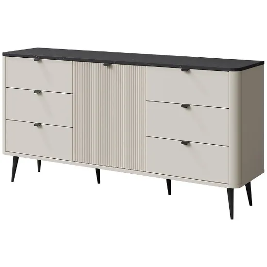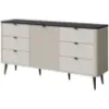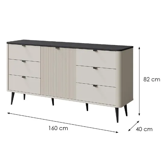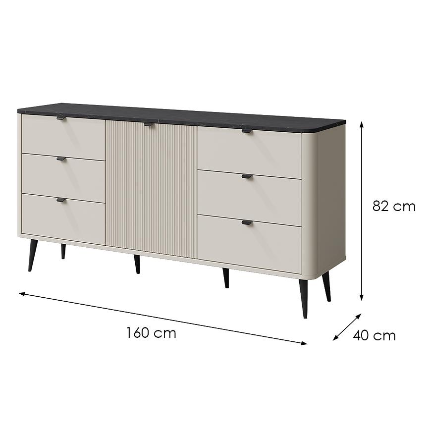 Komoda Marly 9 o szerokości 160 cm to pojemny i stylowy mebel z sześcioma szufladami i jedną szafką. Kolorystyka Kashmir/Szary Kamień nadaje jej nowoczesny, elegancki wygląd. Idealna do przechowywania w salonie, sypialni lub jadalni – łączy funkcjonalność z estetyką.