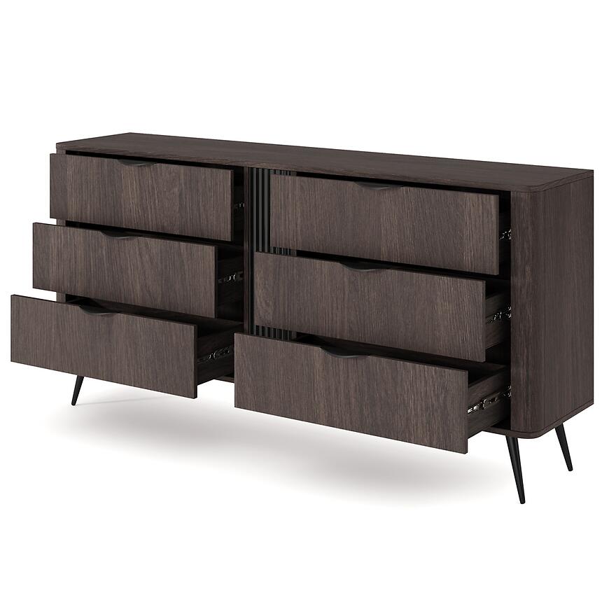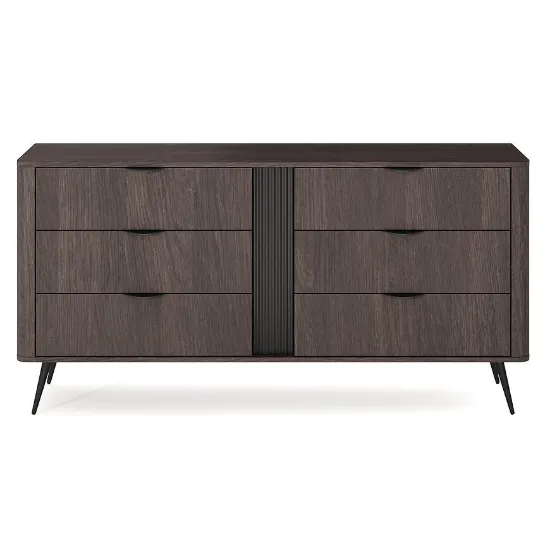 Fronty i korpus komody Veris utrzymane są w tym samym kolorze dąb dunin, co zapewnia jednolity i elegancki wygląd. Matowe wykończenie frontów oraz korpusu nadaje meblowi nowoczesny charakter i ogranicza widoczność odcisków palców, co jest szczególnie istotne w codziennym użytkowaniu. Ciemne drewnopodobne wybarwienie dobrze wpisuje się w aktualne trendy wnętrzarskie, inspirowane naturalnymi strukturami drewna.