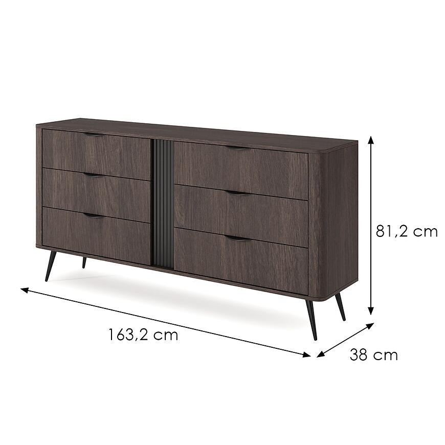 Komoda Veris z kolekcji VERIS to propozycja dla osób, które szukają mebla łączącego estetykę nowoczesnych wnętrz z dużą przestrzenią do przechowywania. Szerokość 163,2 cm, wysokość 81,2 cm oraz głębokość 38 cm sprawiają, że komoda świetnie sprawdzi się zarówno w salonie, jak i w sypialni, jadalni czy przestronnym przedpokoju. Ciemne drewnopodobne wybarwienie w odcieniu dąb dunin nadaje wnętrzu elegancji i harmonijnie komponuje się z jasnymi oraz ciemniejszymi aranżacjami.