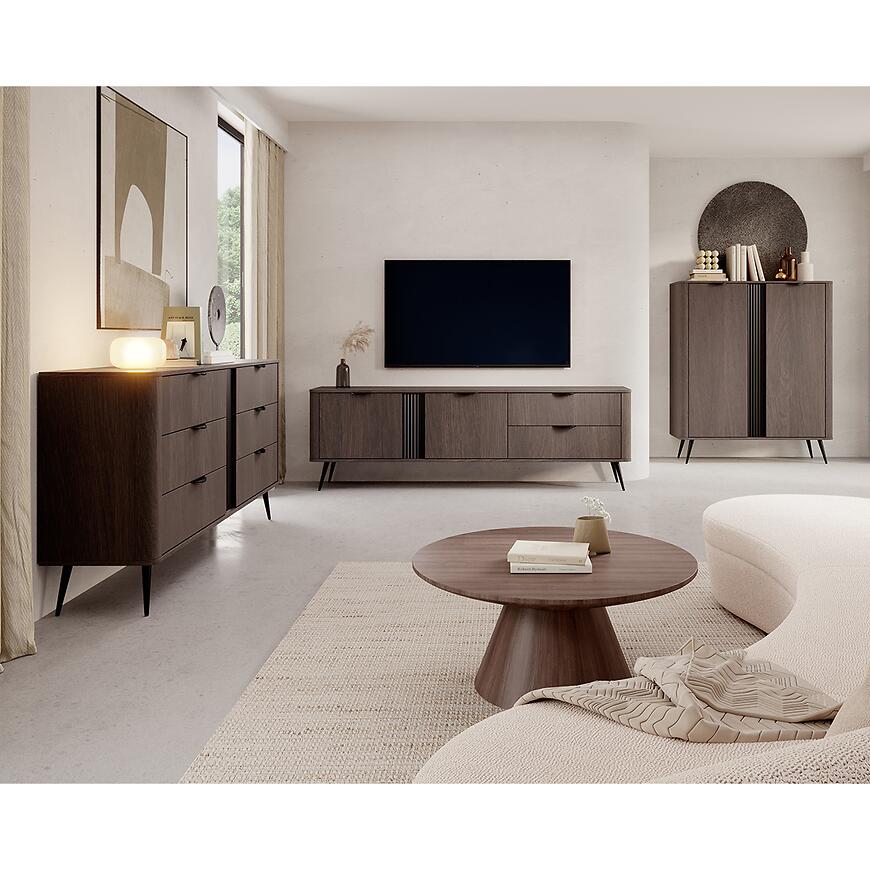 Cztery i więcej szuflad to duży atut komody Veris, szczególnie w przestrzeniach, gdzie liczy się dobra organizacja. Szuflady oferują miejsce na przedmioty codziennego użytku, a także na rzeczy, które warto mieć pod ręką, lecz poza zasięgiem wzroku. Komoda z szufladami o szerokości ponad 160 cm sprawdzi się jako mebel do przechowywania w salonie, funkcjonalna komoda do sypialni lub elegancka komoda do jadalni.