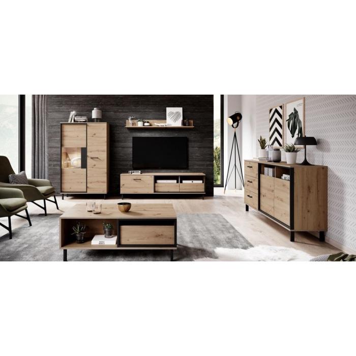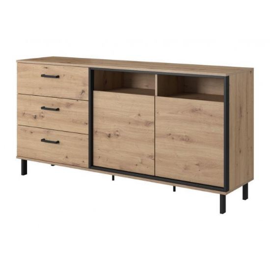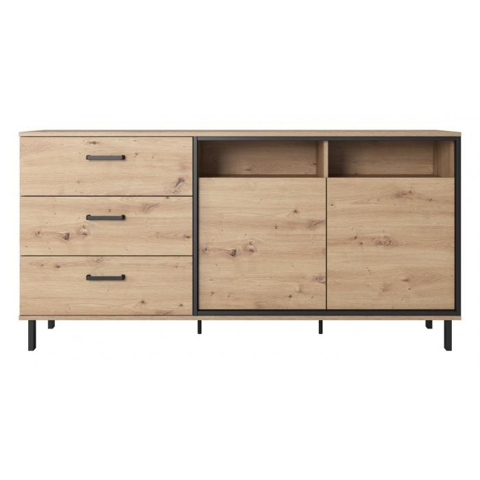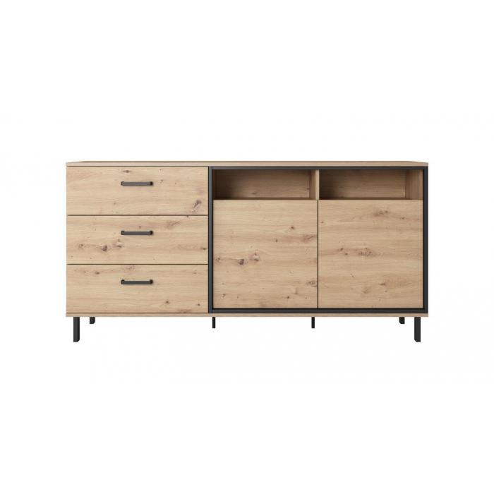 Korpus i fronty komody wykonane w wybarwieniu dąb artisan z czarnymi wstawkami we frontach. Komoda posiada 3 pojemne szuflady oraz drzwi za którymi znajdują się dodatkowe półki do przechowywania. Nóżki i uchwyty komody Nest zostały wykonane z metalu w kolorze czarnym. Bryły wykończone listwą MDF w kolorze antracyt (czarny). Mebel do samodzielnego montażu.