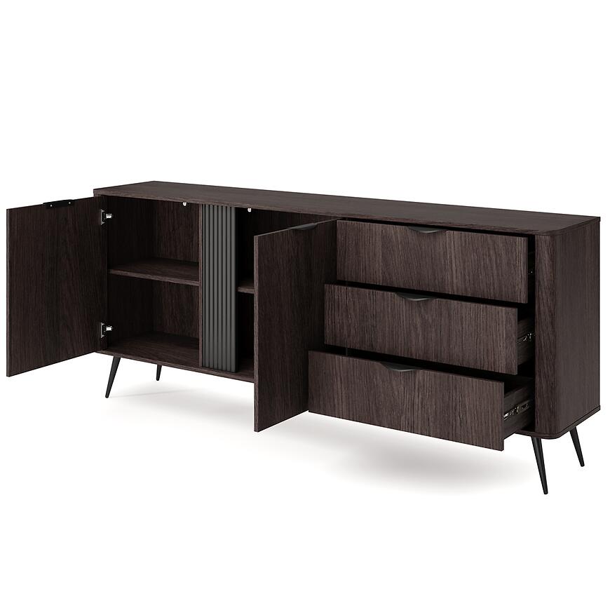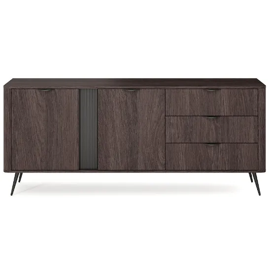 Brak wbudowanego oświetlenia sprawia, że komoda Veris zachowuje minimalistyczny charakter i nie dominuje aranżacji wnętrza. Ciemne drewnopodobne wybarwienie w połączeniu z matową powierzchnią pozwala łatwo zestawić mebel z jasnymi ścianami, betonem architektonicznym lub dodatkami w kolorze czerni i grafitu. To dobra propozycja dla osób, które cenią spójny wygląd i stonowaną kolorystykę.