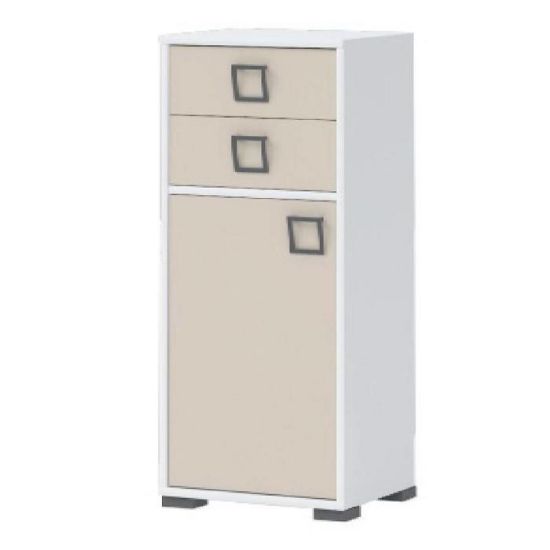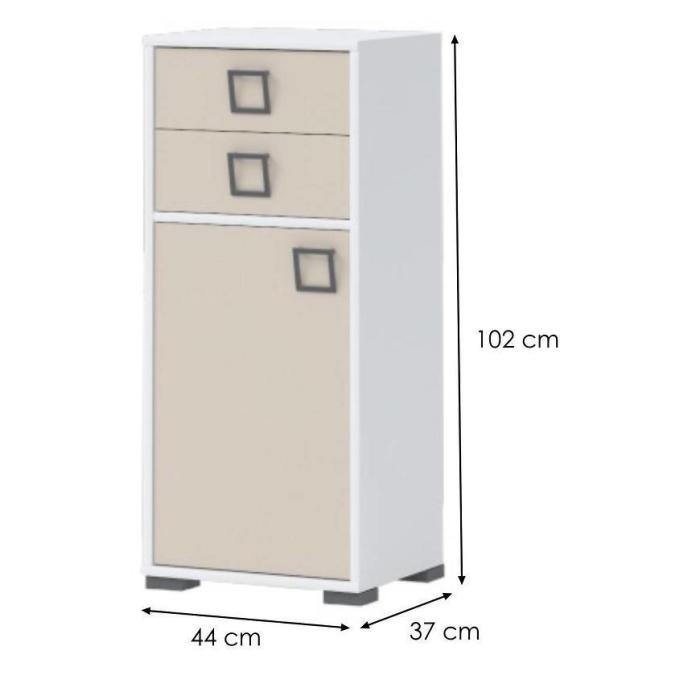 Komoda KIKI to doskonała propozycja do pokoju młodzieżowego, a także salonu, przedpokoju czy pokoju dziennego. Doskonale sprawdzi się jako funkcjonalna komoda do przechowywania. Posiada dwie szuflady oraz jedną szafkę, dzięki czemu ma łatwy dostęp do wnętrza oraz wystarczającą przestrzeń do przechowywania. Materiał korpusu i frontów z którego została wykonana komoda to płyta wiórowa laminowana. Charakteryzuje się interesującym wykończeniem uchwytów, który ożywi wnętrza.