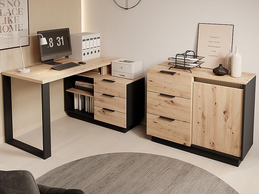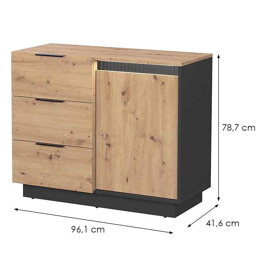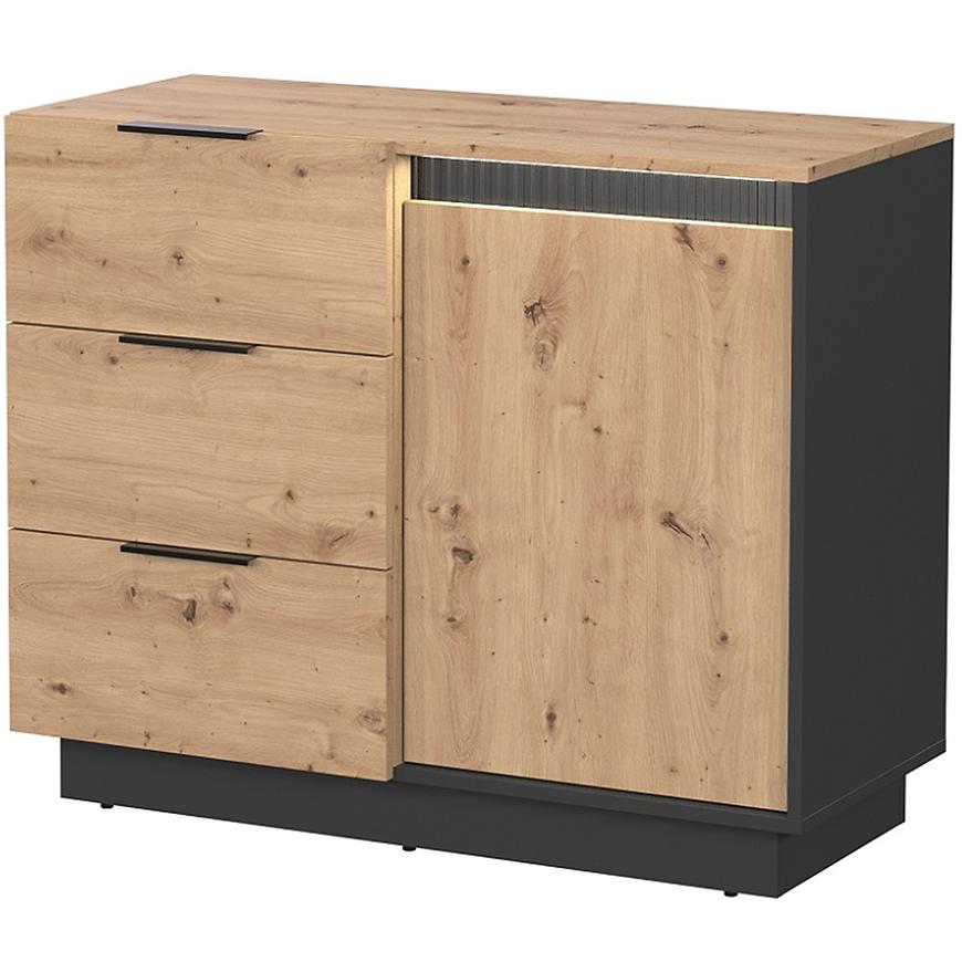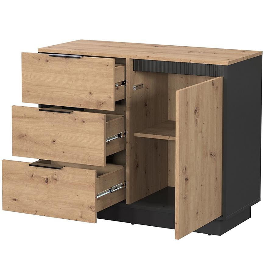 Komoda Sierro 1D3S Dąb Artisan/Czarny to elegancki i praktyczny mebel, który wspaniale łączy nowoczesny design z funkcjonalnością. Wykonana w modnym wybarwieniu dąb artisan, z subtelnym, matowym wykończeniem, komoda przyciąga uwagę naturalnym, drewnopodobnym wyglądem, który ociepli wnętrze i nada mu przytulności. Fronty i korpus wykonane zostały z wytrzymałej płyty wiórowej laminowanej, co zapewnia trwałość i odporność na codzienne użytkowanie. Akcenty w głębokiej czerni nadają całości wyrazistości i dodają komodzie charakterystycznego, industrialnego stylu.