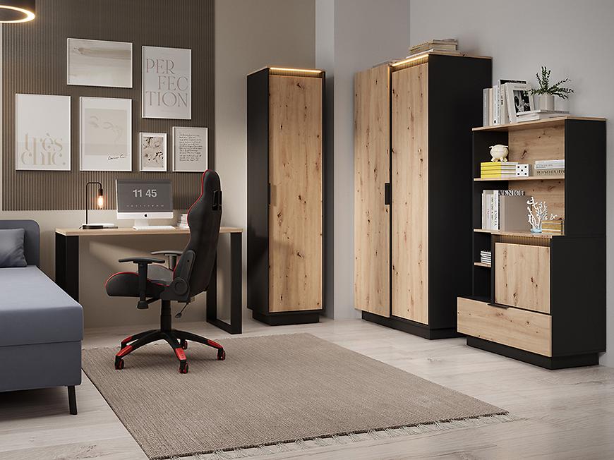 Komoda Sierro 1D3S to mebel o nowoczesnym stylu, który doskonale odnajdzie się zarówno w salonie, sypialni, jak i w przedpokoju. Połączenie ciepłego odcienia dębu artisan z kontrastującymi czarnymi detalami sprawia, że komoda prezentuje się wyjątkowo efektownie, a jednocześnie dopasowuje się do wielu aranżacji – od minimalistycznych po loftowe wnętrza. To idealny wybór dla osób, które cenią funkcjonalność oraz piękny wygląd w jednym.