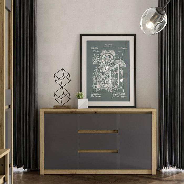 Komoda Malta wpasuje się w każdą przestrzeń. Posiada 2 zamykane szafki oraz 3 szuflady, które pozwolą na odpowiednie zagospodarowanie. Malta doskonale odnajdzie się w każdym pomieszczeniu, również w jadalni czy salonie.