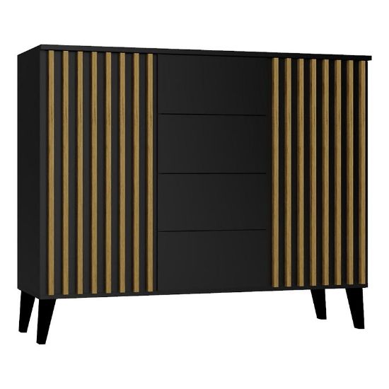 Kolor komody to połączenie czerni z kolorem dąb artisan, co tworzy kontrastowy i stylowy efekt wizualny. Ten design świetnie pasuje do wnętrz urządzonych w stylu loftowym, ale może być również ciekawym akcentem w innych aranżacjach wnętrz.