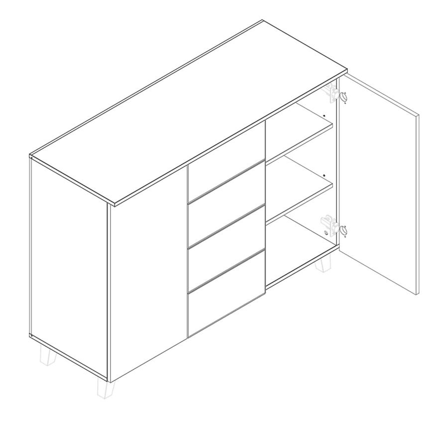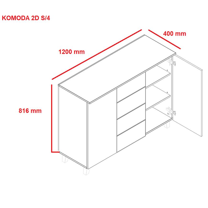 Komoda Lamillo posiada dwudrzwiowy segment oraz cztery szuflady, co sprawia, że jest doskonałym rozwiązaniem do przechowywania różnych rzeczy, od ubrań po akcesoria. Wszystkie elementy komody, zarówno fronty, jak i korpus, wykonane są z wysokiej jakości płyty wiórowej laminowanej. Matowe wykończenie frontów i korpusu nadaje meblom elegancji i nowoczesności, co doskonale współgra z charakterem kolekcji.