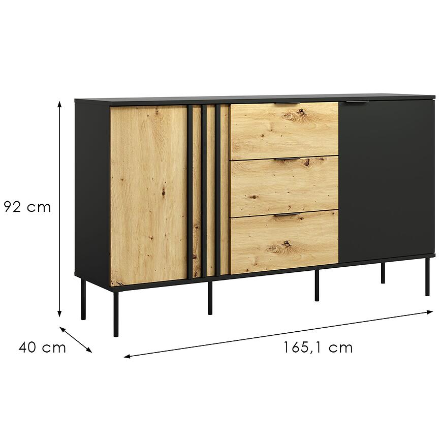 Dzięki przemyślanej konstrukcji komoda oferuje dużą przestrzeń do przechowywania. Model wyposażony jest w 2 drzwi oraz 3 praktyczne szuflady, które pomieszczą zarówno dokumenty, tekstylia, jak i akcesoria codziennego użytku. Szerokość 165,1 cm, wysokość 92 cm oraz głębokość 40 cm sprawiają, że mebel doskonale sprawdzi się zarówno w większych, jak i średnich pomieszczeniach.