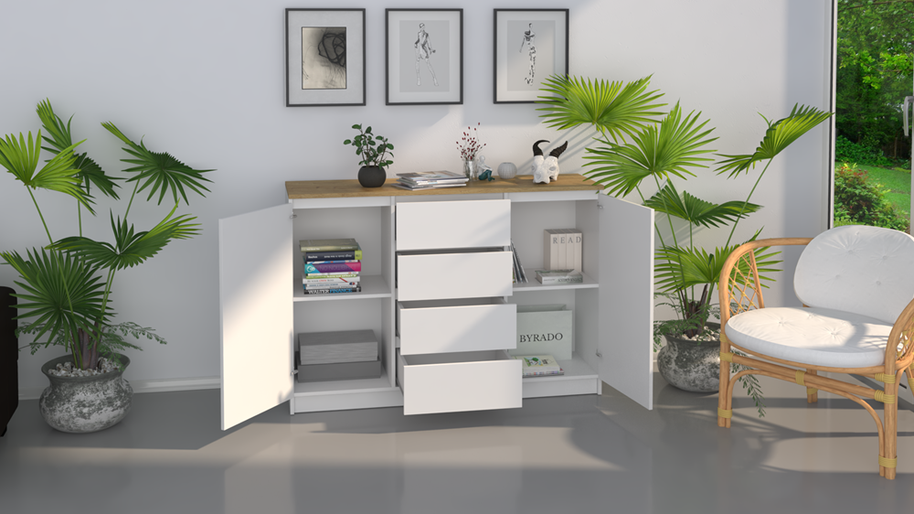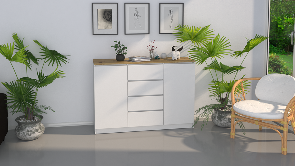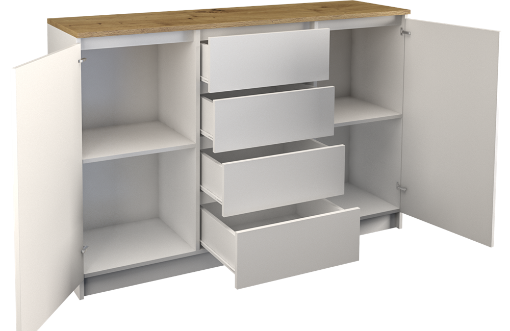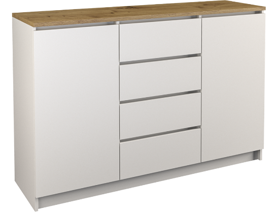 Komoda Aramis to prosta, uniwersalna i pojemna bryła, którą wyróżnia również bardzo ergonomiczna konstrukcja. Cztery szuflady umieszczonych pomiędzy dwoma parami drzwi dają wyjątkowo dużą przestrzeń do przechowywania. Komoda posiada funkcjonalny blat o grubości 22mm, który można wykorzystać np. charakterze miejsca na telewizor (szczególnie w pomieszczeniach, w których nie ma przestrzeni na tradycyjną szafkę RTV). Idealna komoda do salonu w stylu scandi lub nowoczesnej sypialni! Płyta laminowana o grubości 16 mm zapewnia solidność i wytrzymałość. Mebel do samodzielnego montażu.