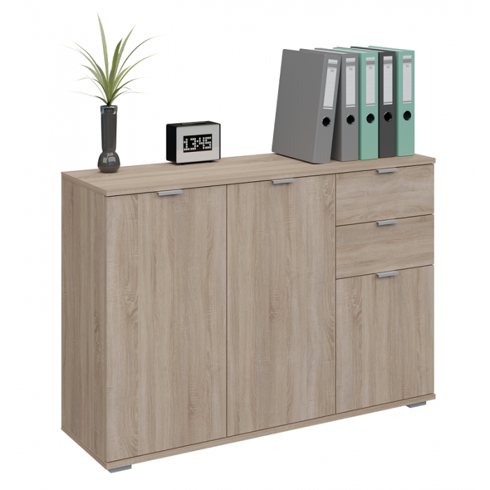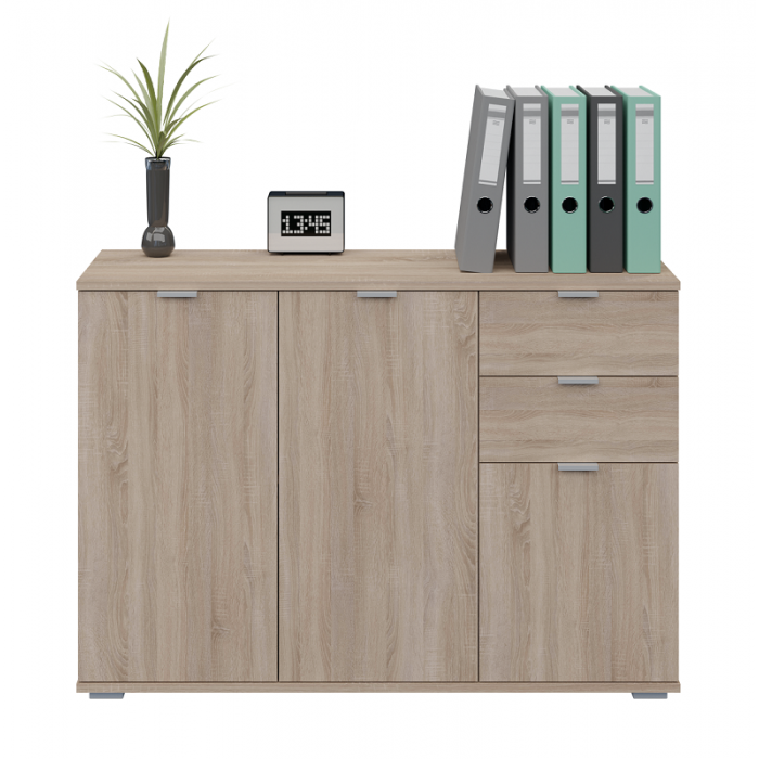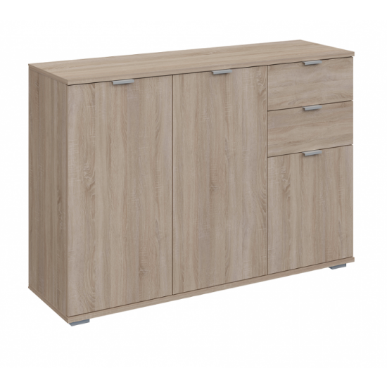 Komoda Easy 1 świetnie sprawdzi się w przedpokoju, z powodzeniem można również ustawić ja w sypialni czy pokoju dziennym. Wpasuje się w wiele aranżacji w klasycznych wnętrzach, jak również w tych nowoczesnych. Posiada dwie pojemne szuflady które zapewniają odpowiednią przestrzeń do przechowywania. Za drzwiami znajdują się dodatkowe półki, uchwyty wykonane zostały z tworzywa sztucznego w kolorze srebrnym. W szufladach zastosowano metalowe prowadnice kulkowe. Dostępna w dwóch kolorach biały matowy oraz dąb sonom. Materiał korpusu jak i frontów z którego została wykonana komoda Easy 1 to płyta laminowana.